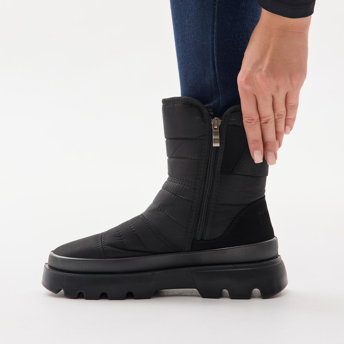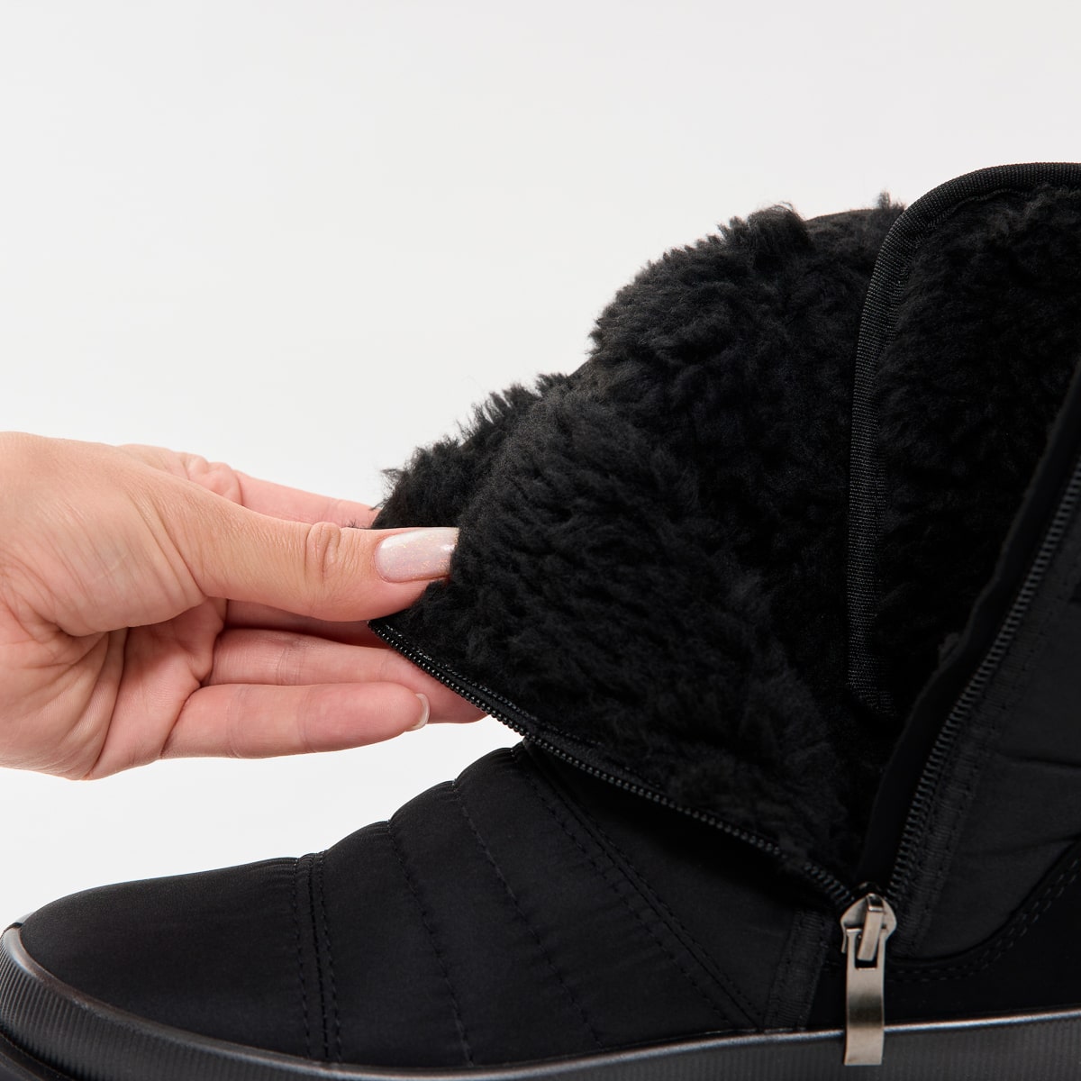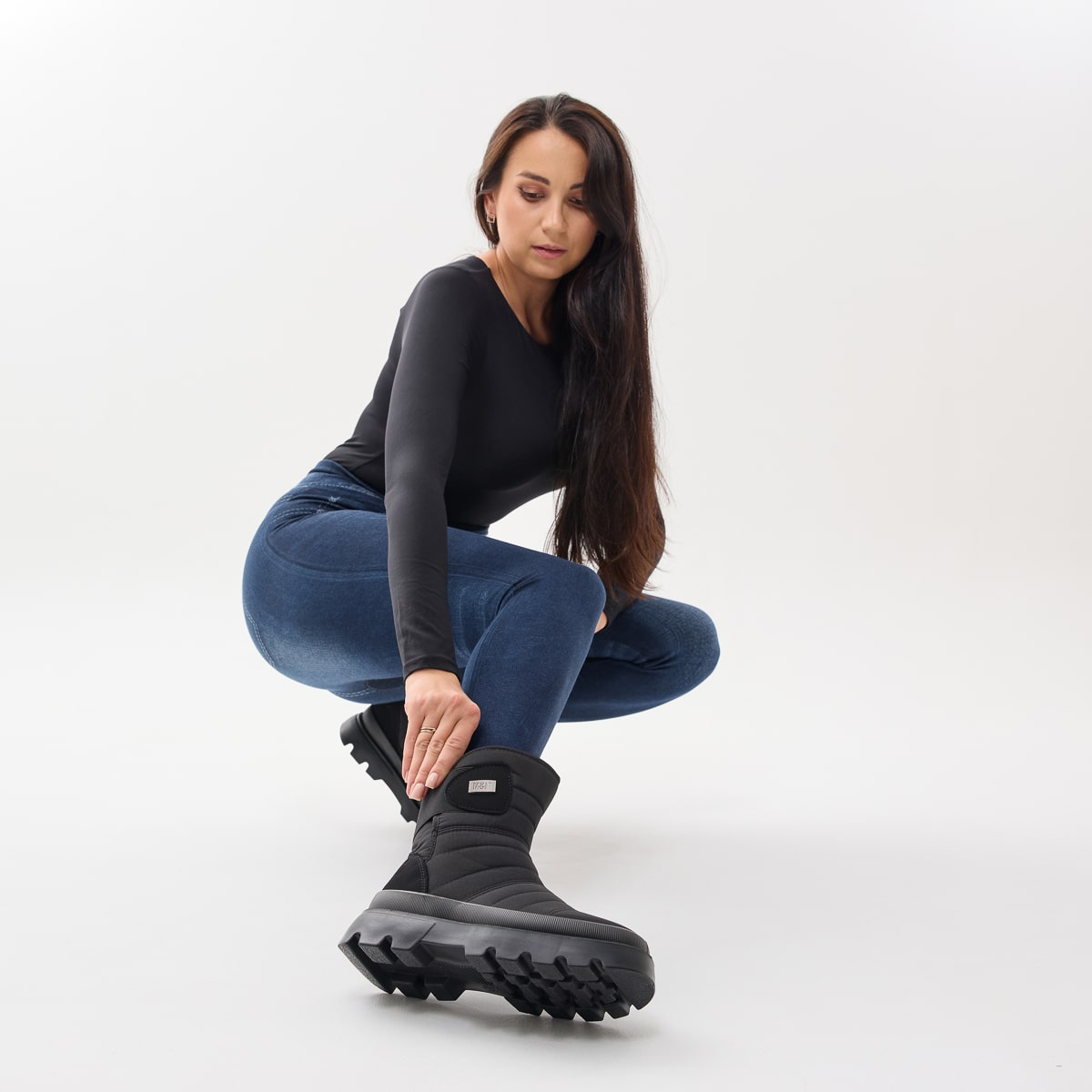 Функціональний вибір для активних жінок, які не бояться снігу та дощу. Верх виконано з водовідштовхувального текстилю, який утворює бар’єр для вологи та вітру, забезпечуючи сухість навіть під час мокрого снігу.Тепле еко-хутро всередині зберігає тепло при низьких температурах, а легка гнучка підошва з ПВХ забезпечує стабільність і чудове зчеплення з поверхнею.