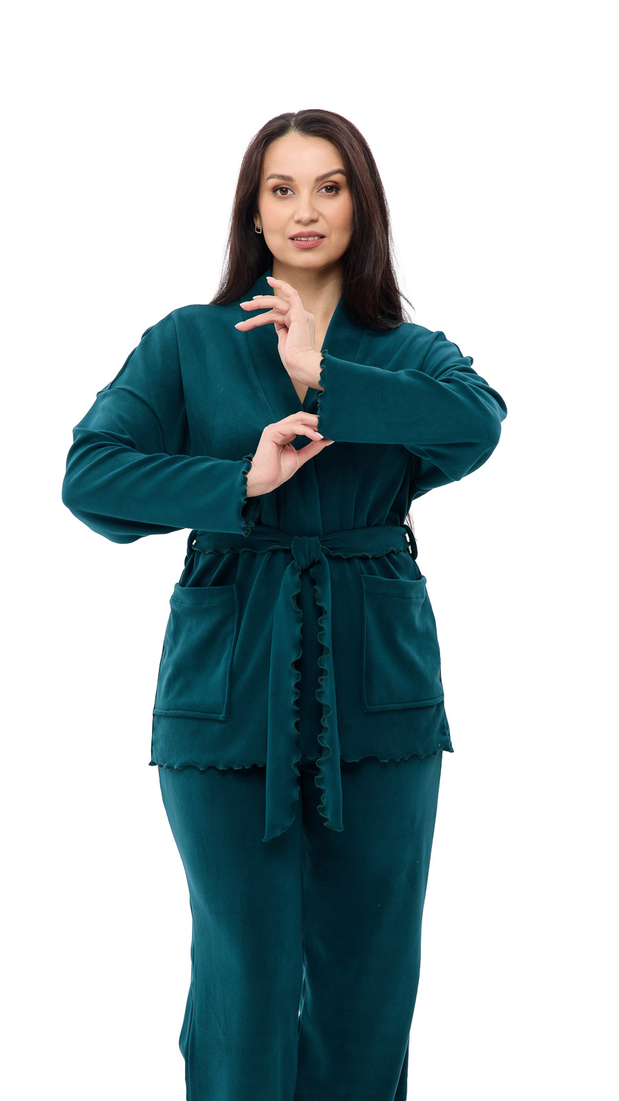 Стильный домашний женский комплект создан для настоящего уюта и женственности. Модель состоит из мягкой кофты на запах с поясом и удобных брюк прямого кроя. Лаконичный дизайн дополнен аккуратными волнистыми краями по низу изделия и рукавам, что придает образу легкость и деликатность.