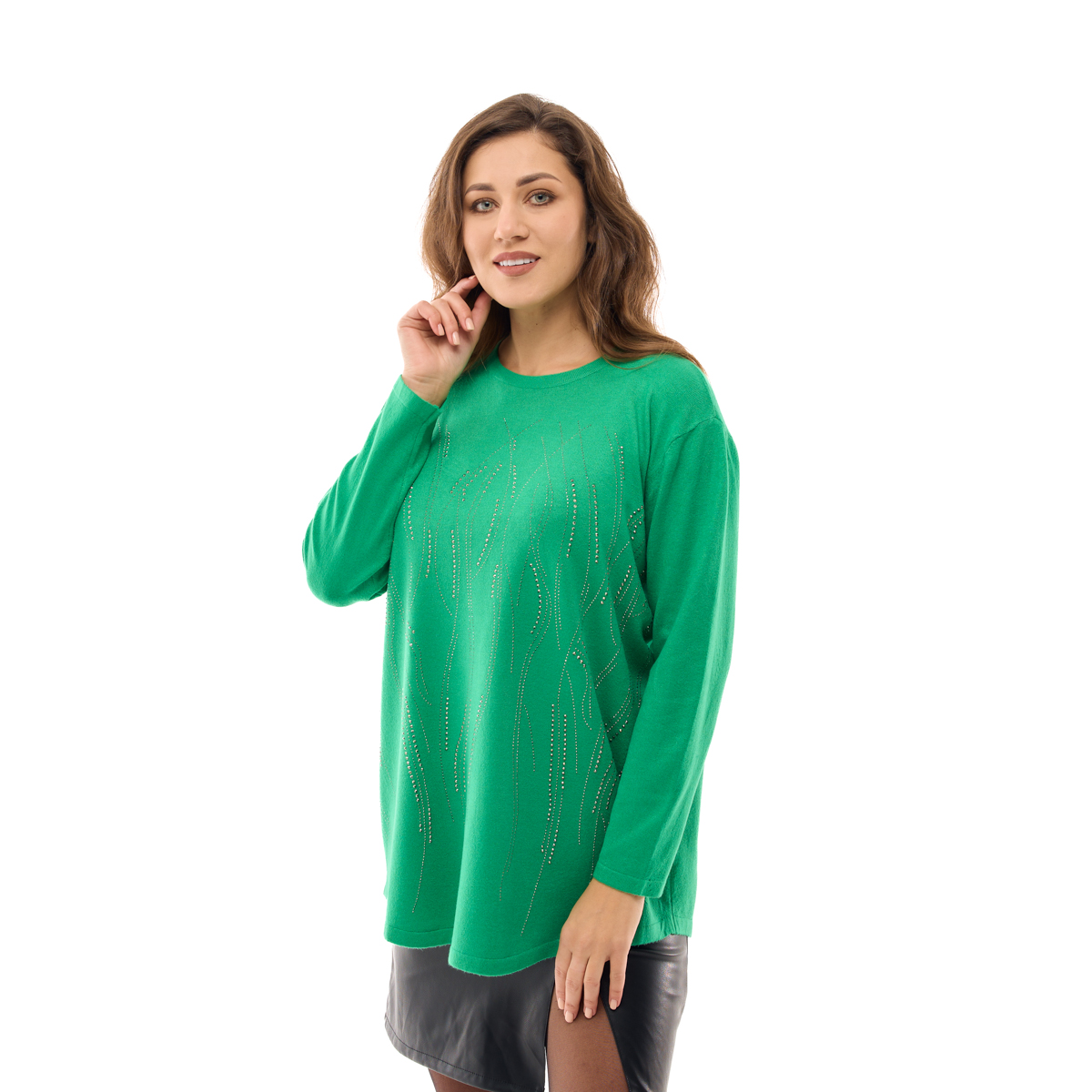 Джемпер Анджелина обеспечит Вам праздничное настроение, даже в пасмурную погоду. Сияние стразов, которыми он украшен, подарят Вам свет и радость. Обратите внимание на крой в форме трапеции. Он идеально садится на любой тип фигуры. Быть женственной легко!