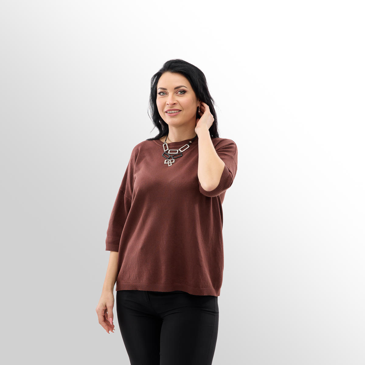 Джемпер Мелания - универсальное дополнение к Вашему гардеробу. Свободный крой идеально садится на любой тип фигуры. Вы можете сочетать его с любой одеждой - джинсы, брюки, юбки! Рукава три четверти добавляют удобства и функциональности.