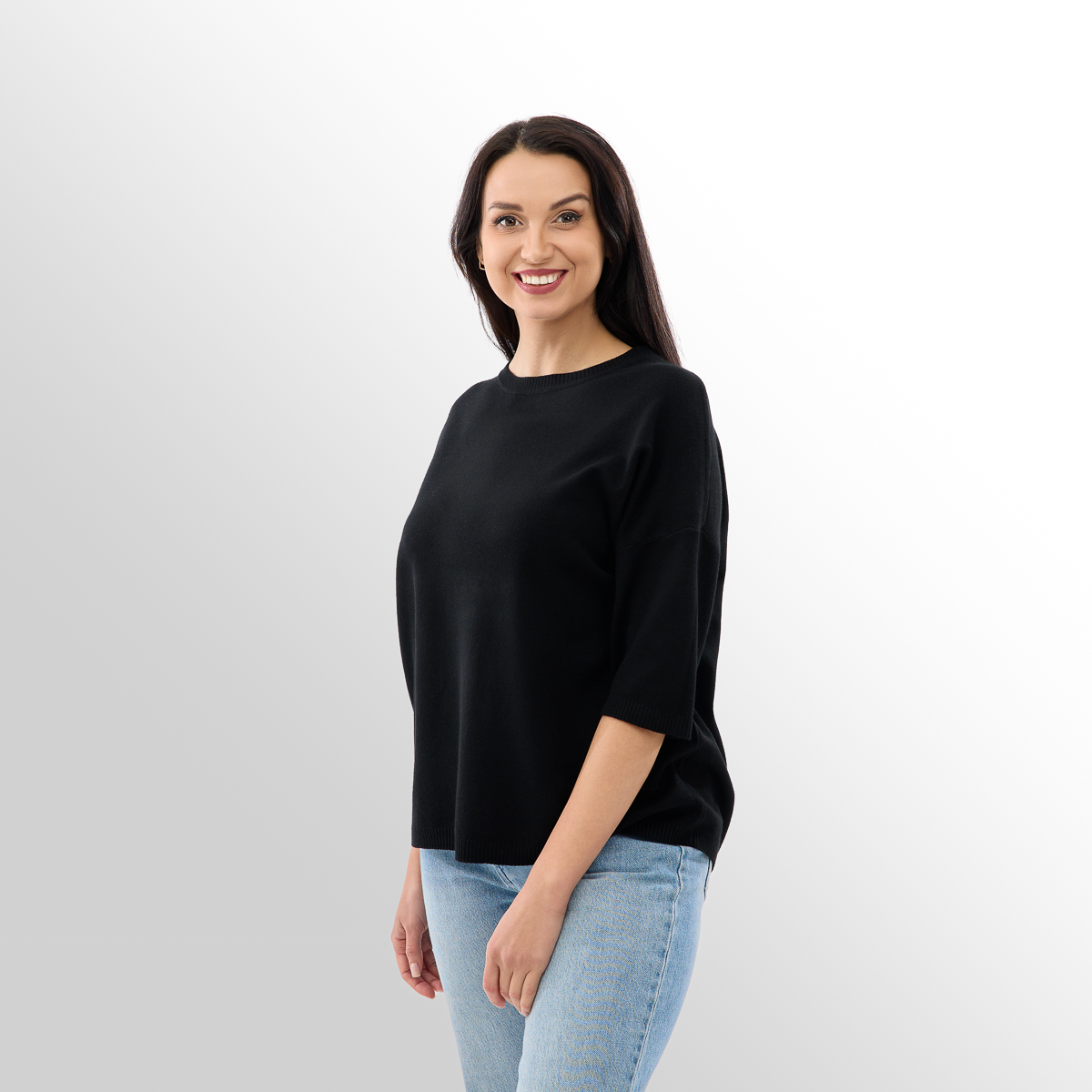 Рукава длиной три четверти добавляют образу утонченности и удобства. Такая длина делает джемпер практичным – он не мешает в движениях, но при этом сохраняет тепло и подходит для носки в любое время года.