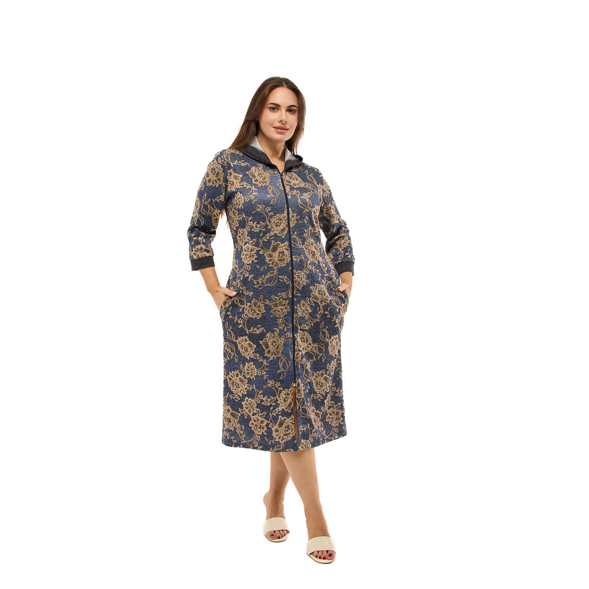 Капюшон добавляет тепла и уюта, карманы обеспечивают удобство, а застежка-молния делает использование халата максимально простым и комфортным.