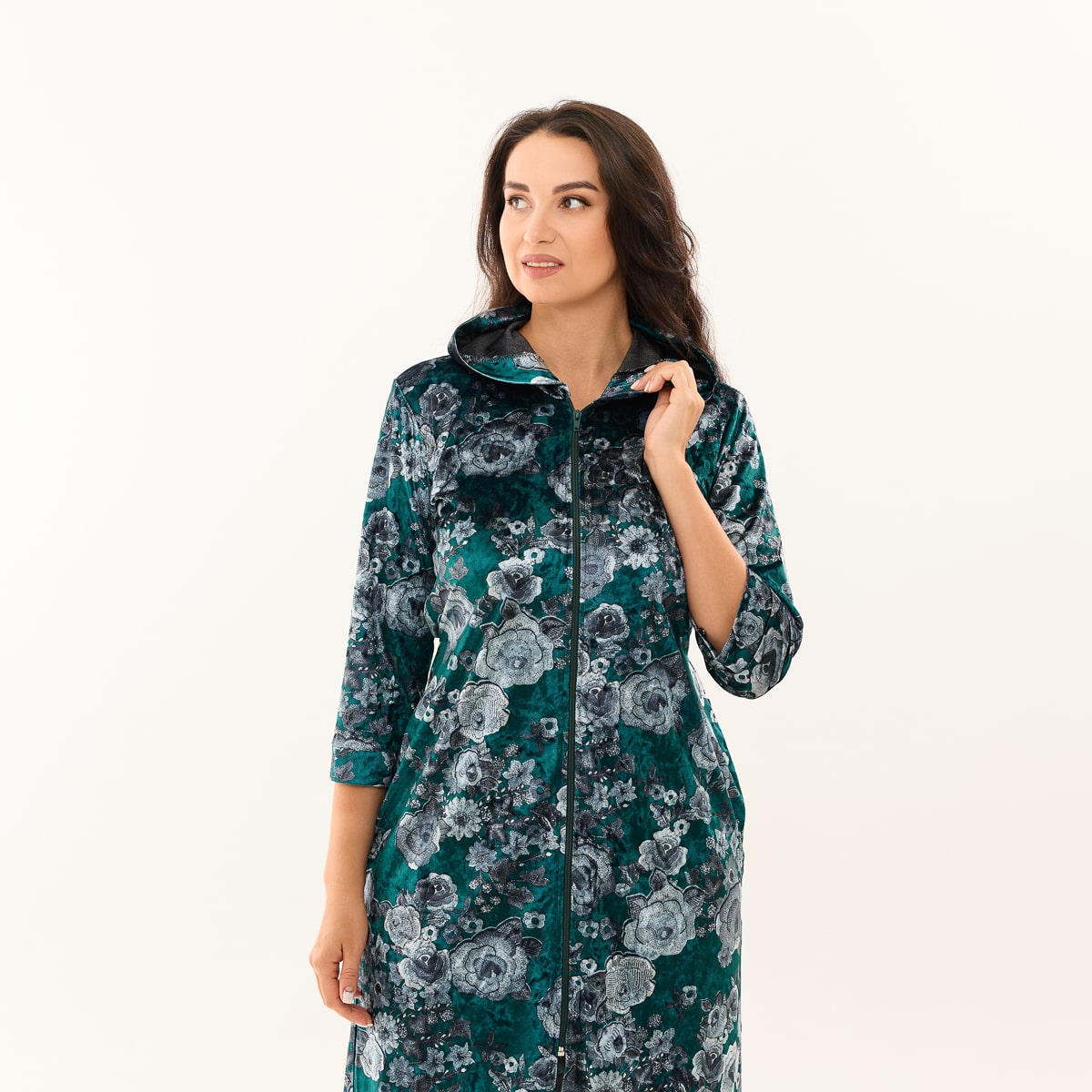 Крой - Халат велюровый на молнии с капюшоном и двумя боковыми карманами