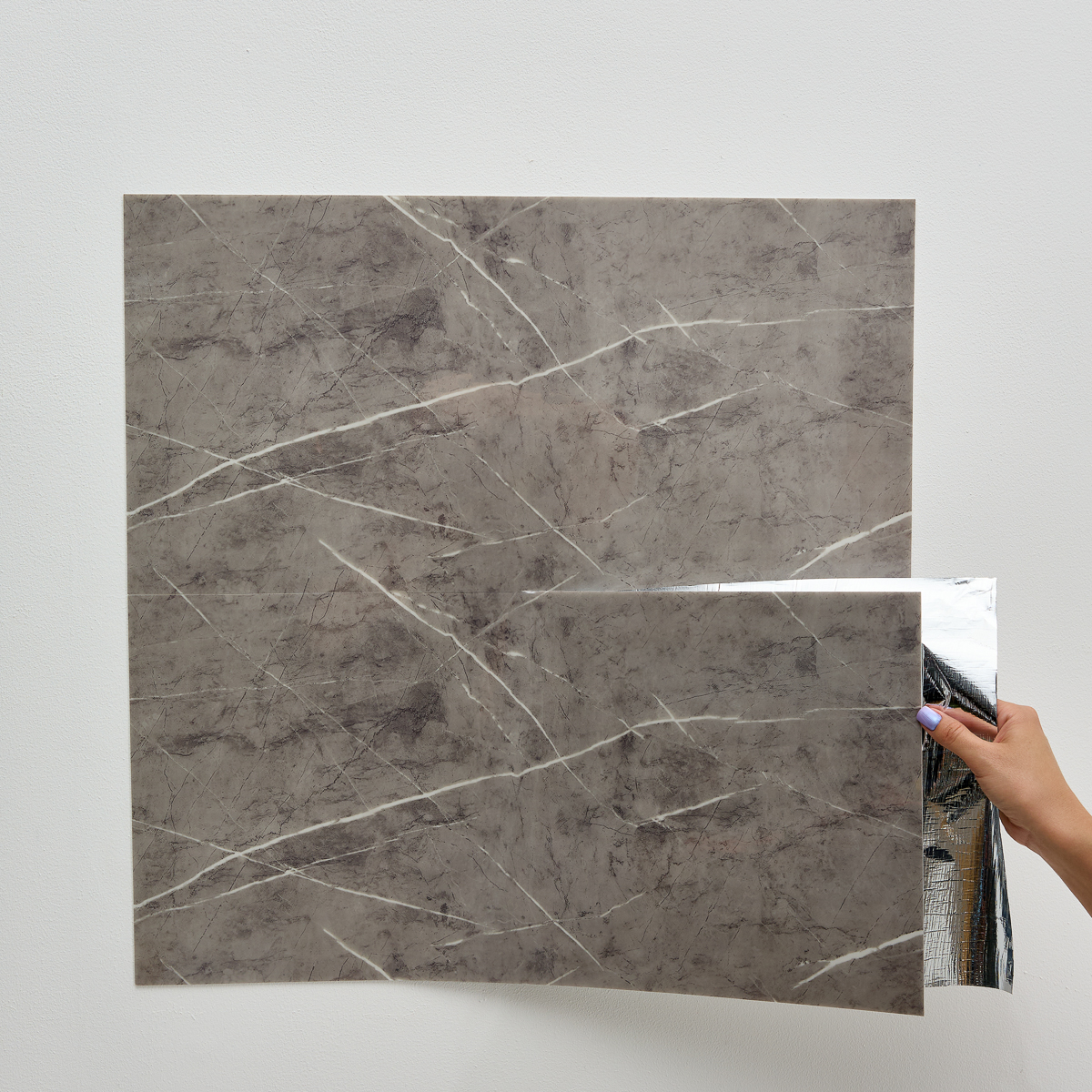 Шаг 2 Снять защитную пленку с обратной стороны самоклеящейся плитки, чтобы открыть клейкую поверхность.