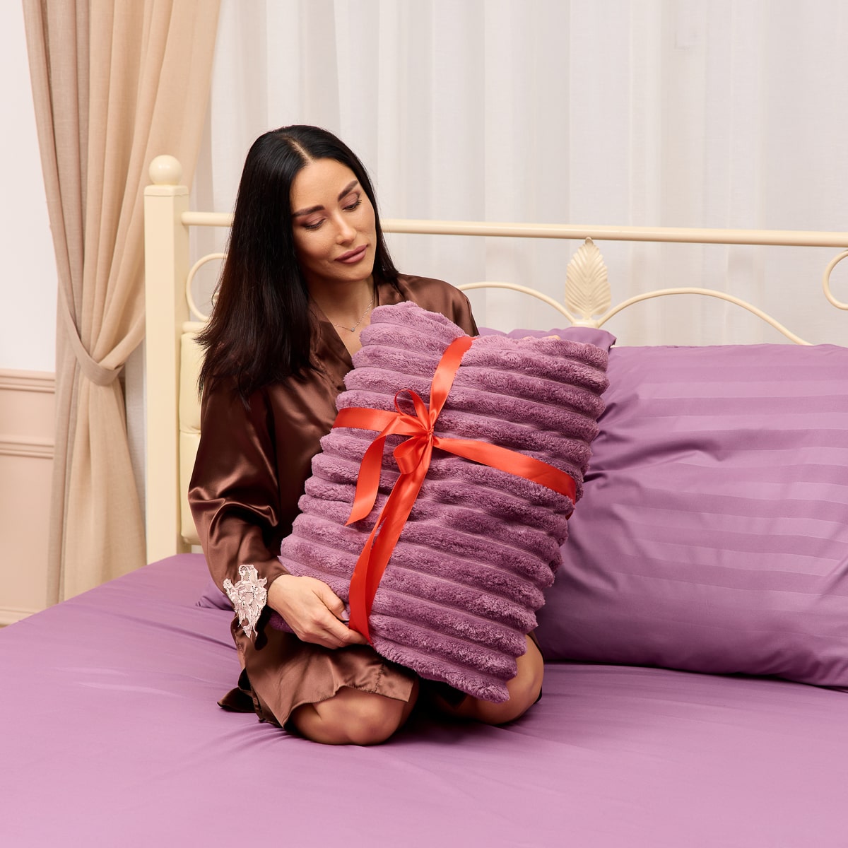 В комплект входит простыня, две наволочки (50×70 или 70×70 см), а также роскошный бархатный плед, который придаёт ещё больше тепла и изысканности. Плед можно использовать как декоративный элемент или как мягкое покрывало для прохладных вечеров.