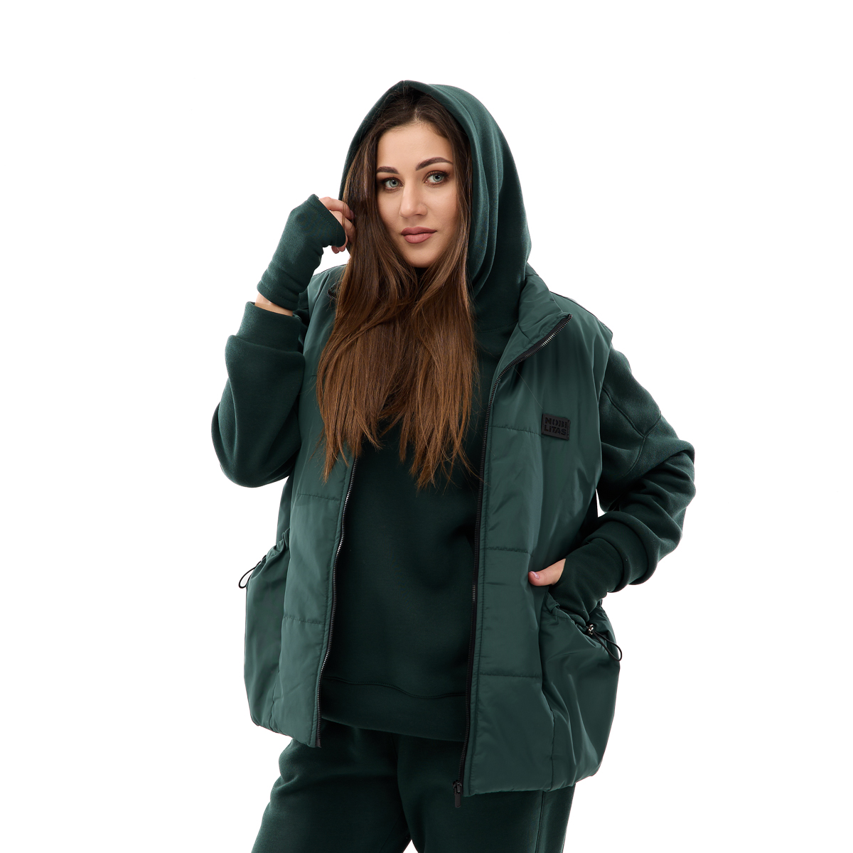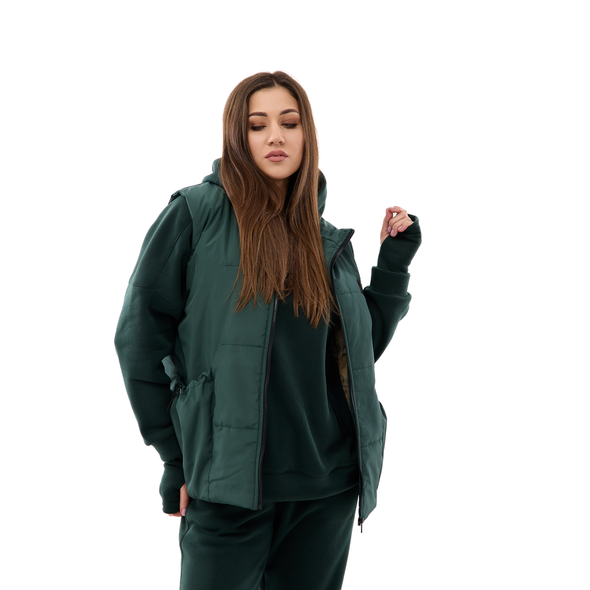 В одном комплекте вы получаете свободное худи, удобные брюки и стильный жилет. Это идеальный вариант для разных сезонов и ситуаций – носите элементы костюма вместе или по отдельности, создавая разные образы.