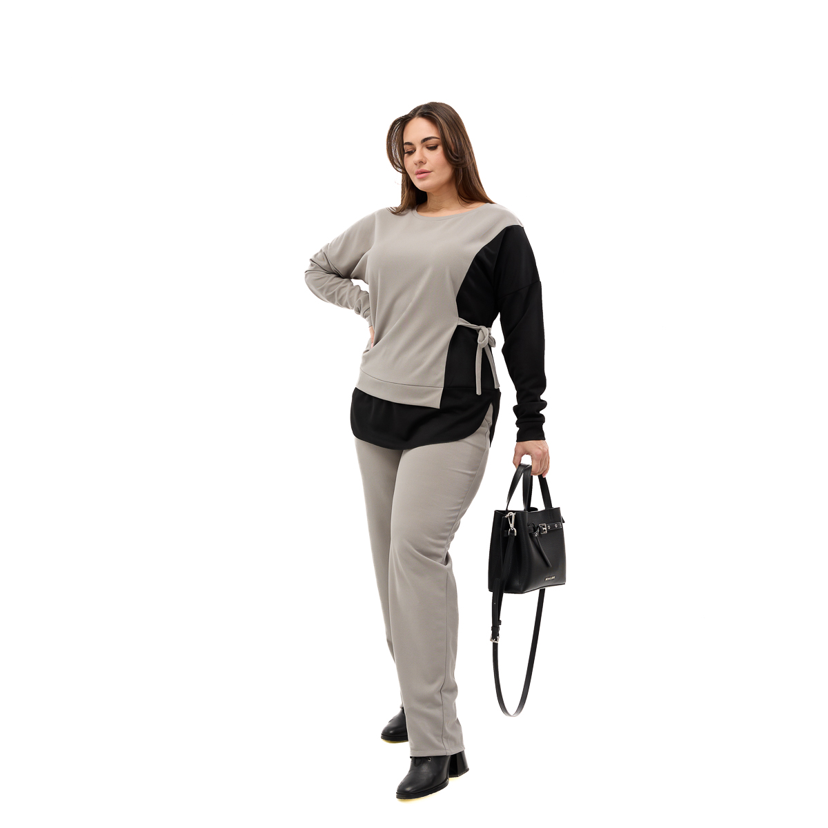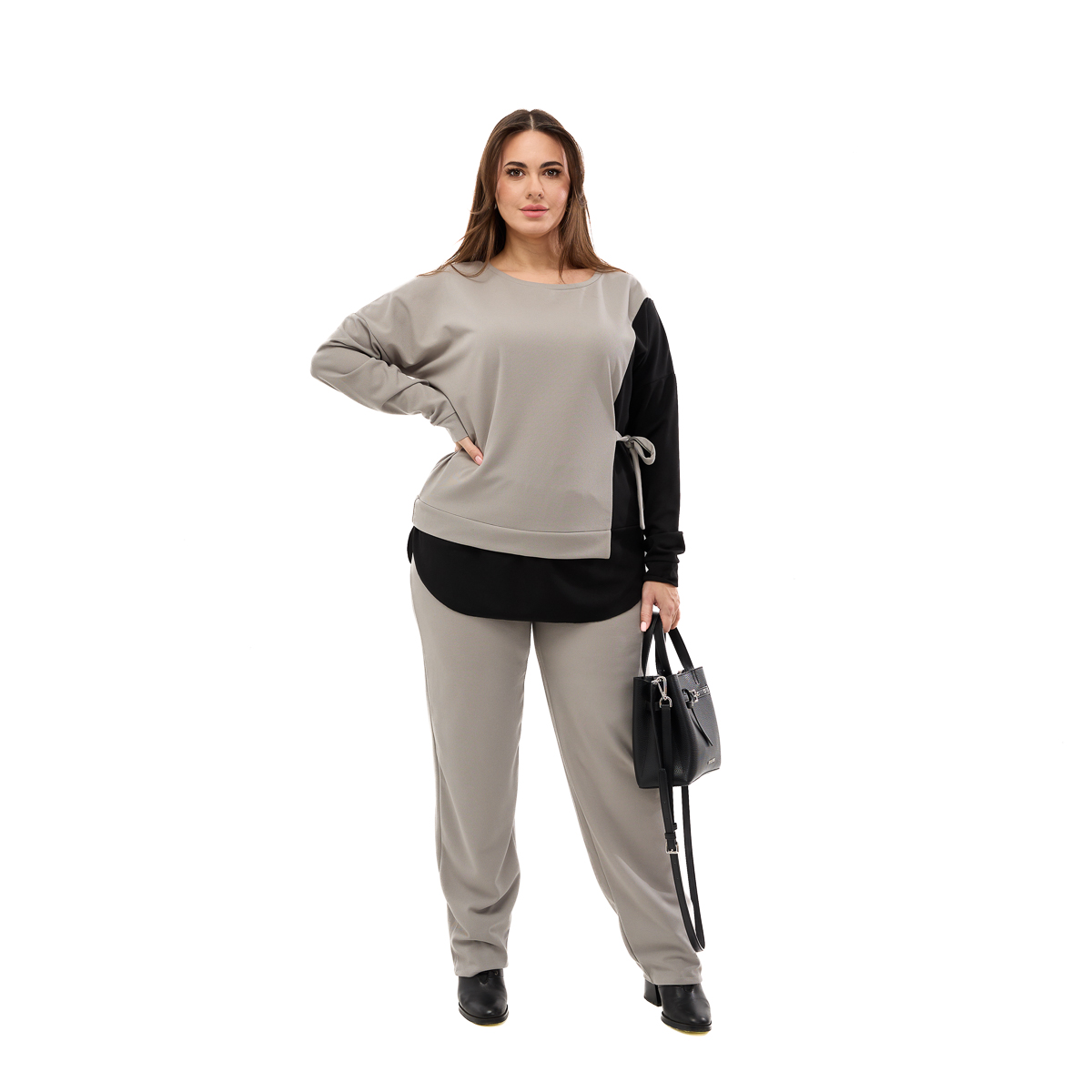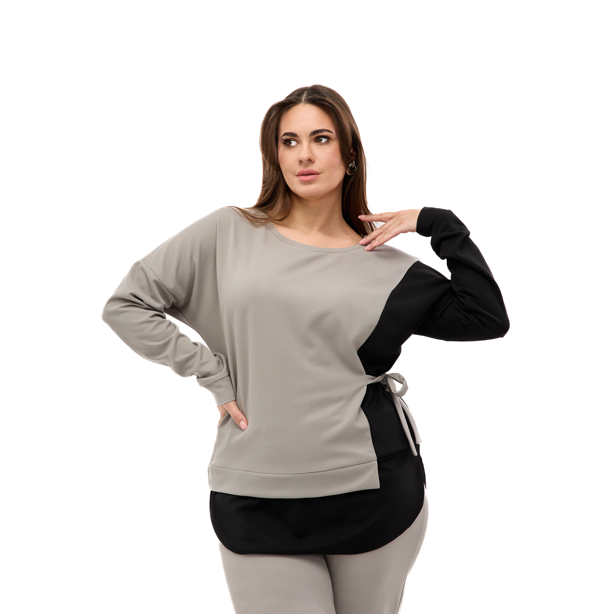 Корректирующий эффект – специальная завязка на блузе скрывает несколько размеров и подчеркивает женственные линии силуэта.