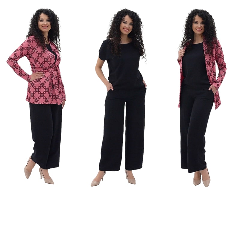 Что касается цветовой палитры, то представленные варианты в розовом, фиолетовом и золотистом оттенках подарят возможность выбрать то, что будет гармонировать именно с вашим типом внешности. И, конечно, великолепные материалы! Льняная основа блузы и брюк дарит ощущение прохлады даже в жаркий день, а мягкий трикотаж кардигана обогреет в прохладные вечера.