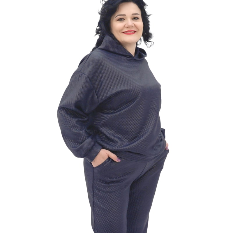 Для створення цього образу була обрана концепція затишного худі в поєднанні з комфортними штанами. Худі чудово сідає на фігурі, облягаючи плечі і спускаючись вниз вільним драпірованим кроєм, створюючи розслаблене, але в той же час стильне враження