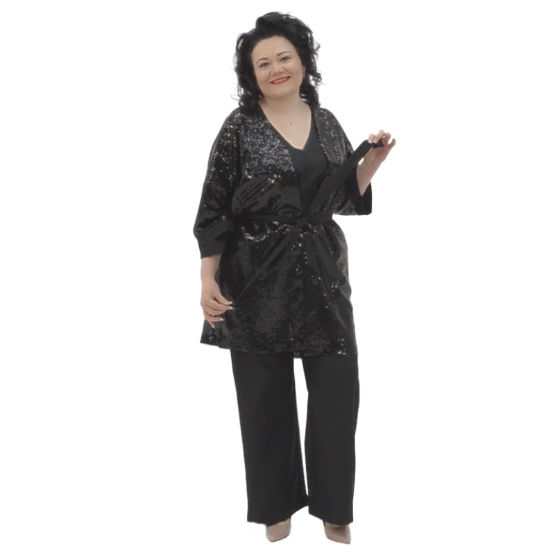 Ищете костюм, который идеально сочетает в себе элегантность, комфорт и стиль, при этом не требуя больших затрат? Распакуй TV предлагает вам отличное решение – Костюм Сияние! Этот костюм не только удобен, но и выглядит роскошно, благодаря сочетанию блузы и брюк прямого кроя с изысканным кардиганом-накидкой на поясе. Его элегантный дизайн с пайетками на кардигане и лаконичность однотонных брюк и блузы добавят изысканности вашему образу.