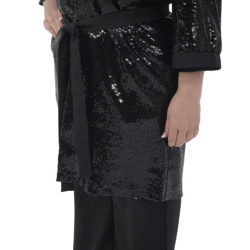 Элегантный дизайн: Пайетки на кардигане и лаконичность брюк и блузы создают изысканный образ.
