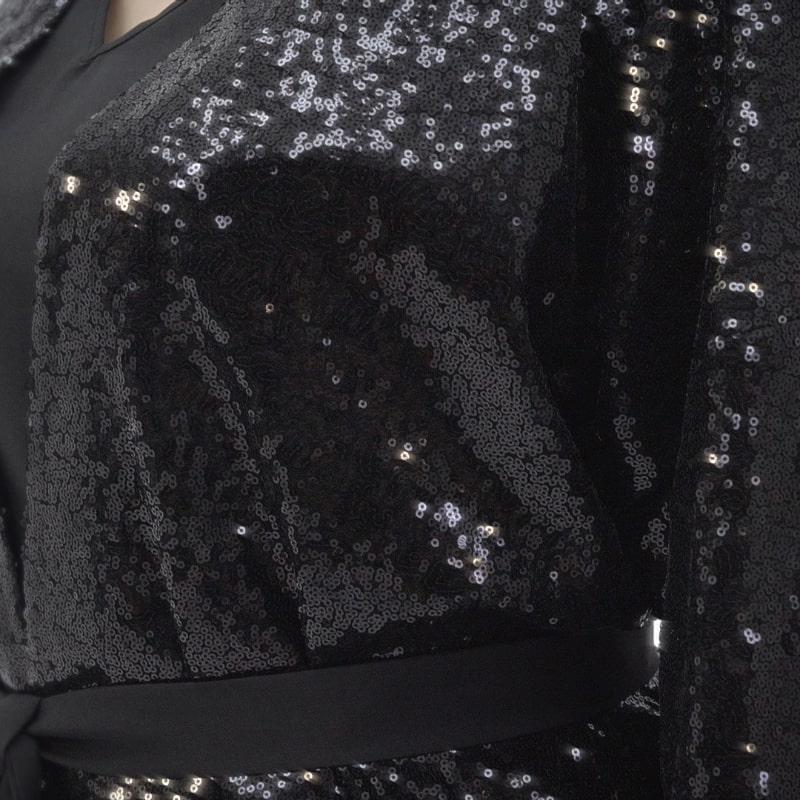 Элегантный дизайн: Пайетки на кардигане и лаконичность брюк и блузы создают изысканный образ.