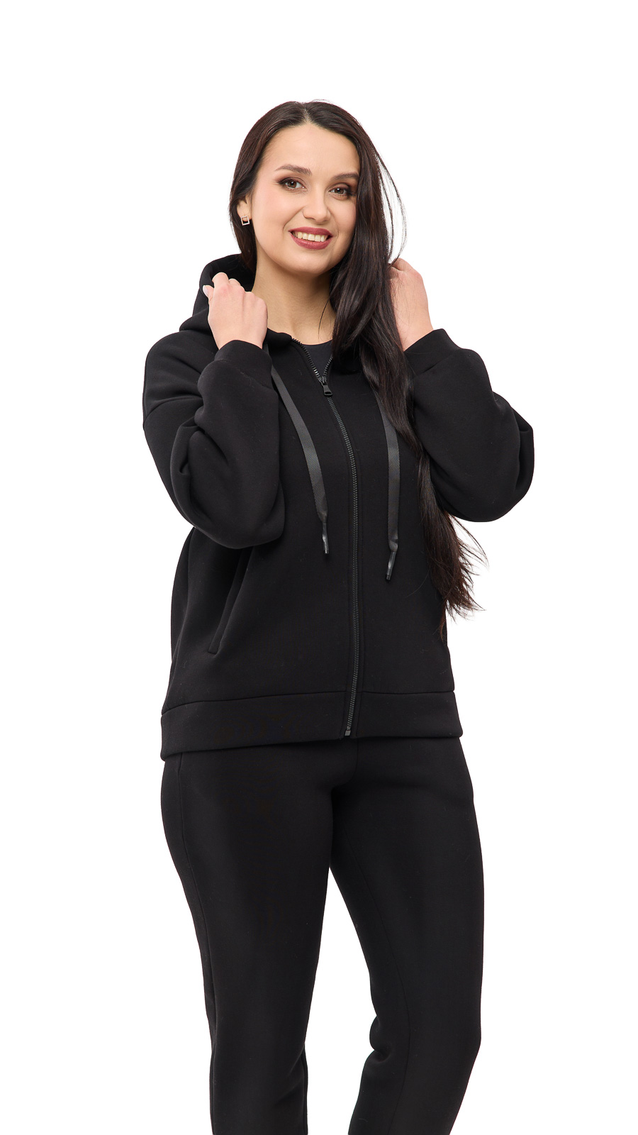 Кофта имеет свободный, но аккуратный крой, который хорошо смотрится на любой фигуре. Капюшон и мягкие манжеты делают образ стильным и в то же время защищают от прохлады.