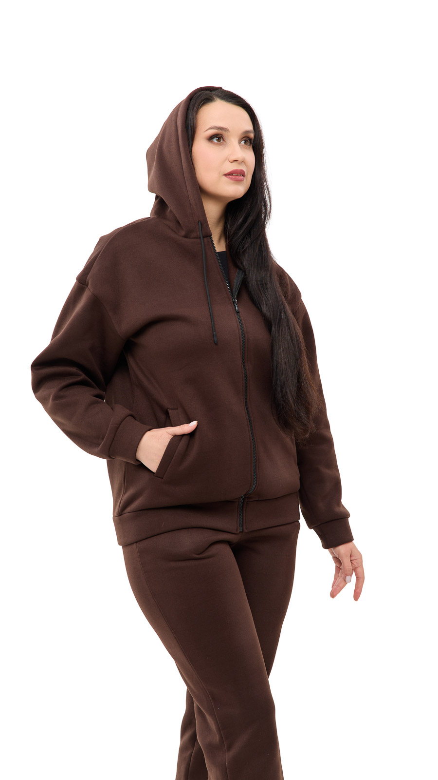Кофта имеет свободный, но аккуратный крой, который хорошо смотрится на любой фигуре. Капюшон и мягкие манжеты делают образ стильным и в то же время защищают от прохлады.