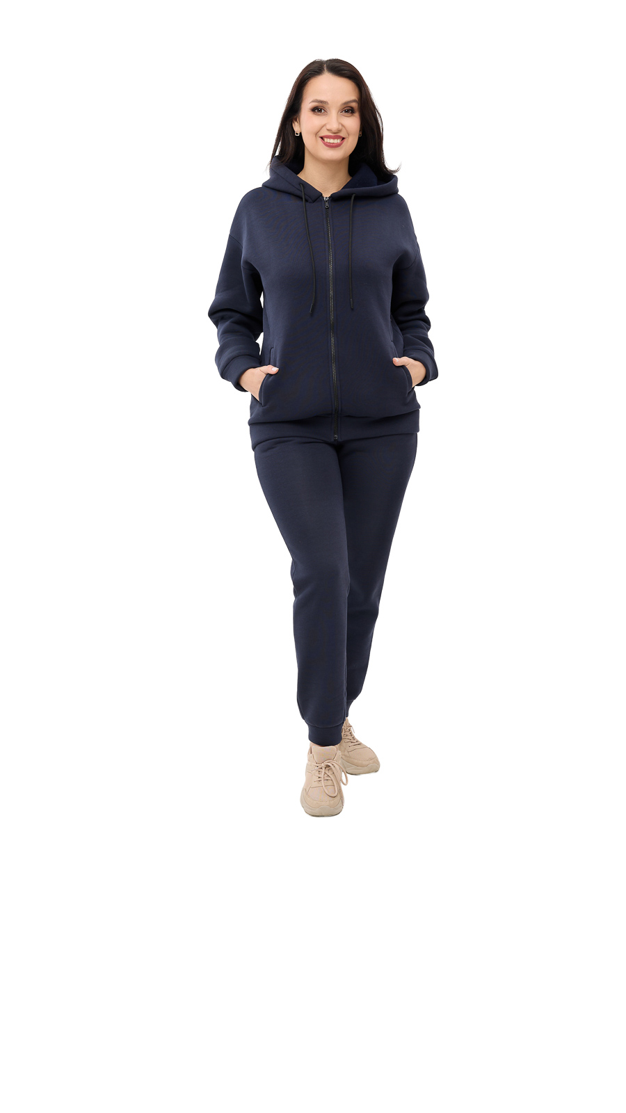 Костюм выполнен из тринитки на флисе — ткани, сочетающей в себе прочность и невероятную мягкость. Она отлично держит форму, не растягивается и сохраняет тепло даже в прохладную погоду.