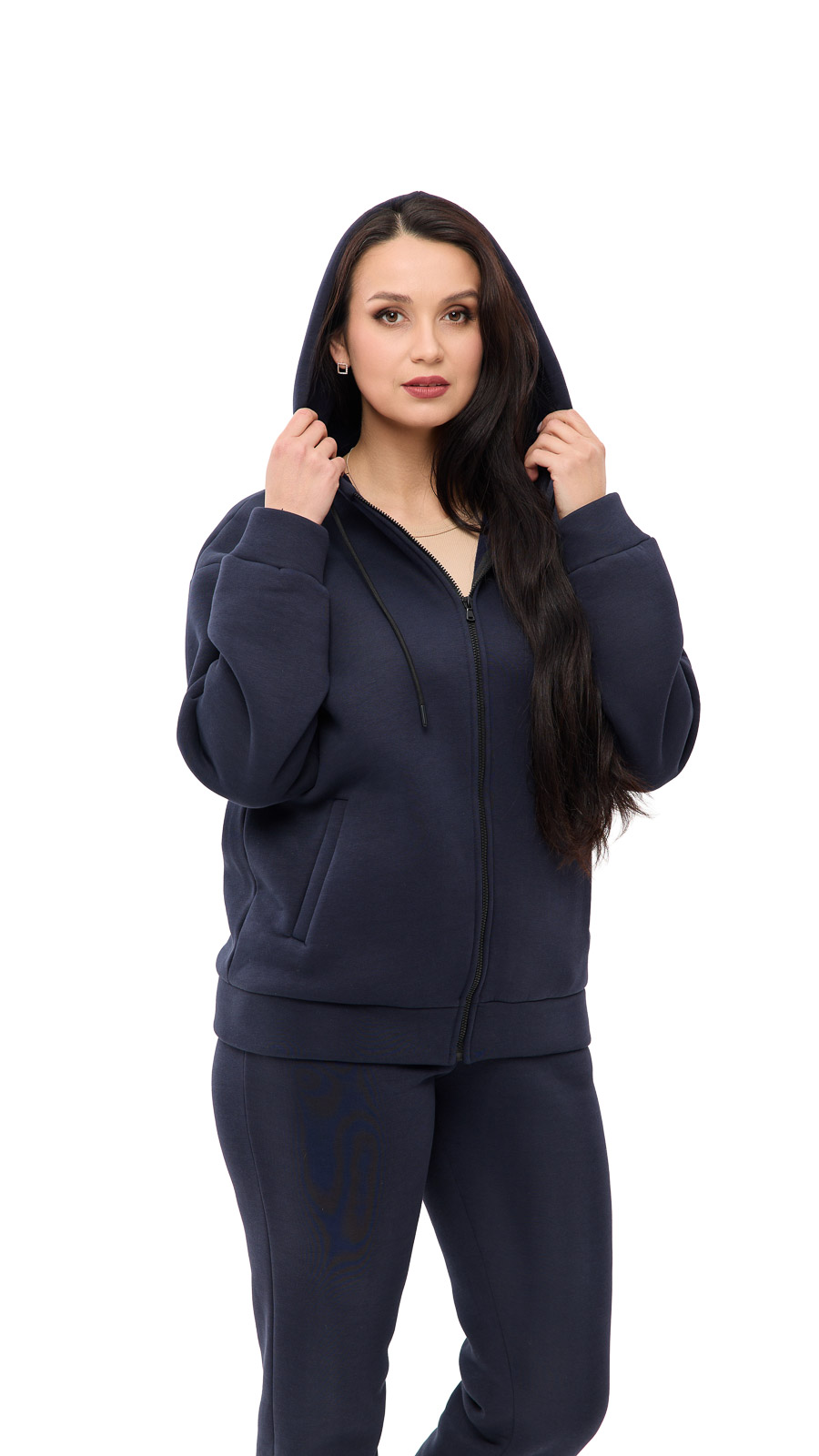 Кофта имеет свободный, но аккуратный крой, который хорошо смотрится на любой фигуре. Капюшон и мягкие манжеты делают образ стильным и в то же время защищают от прохлады.