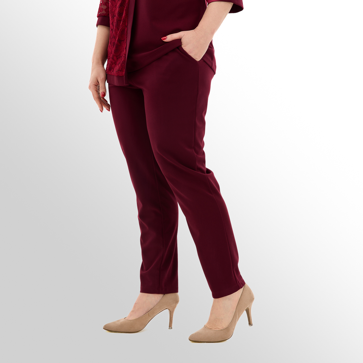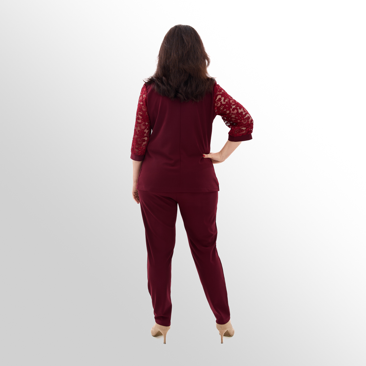 Костюм создан с учётом анатомических особенностей женской фигуры. Блуза с асимметрией и вставками из гипюра визуально вытягивает силуэт и скрывает несовершенства фигуры, создавая огненный и женственный образ. Классические брюки идеально сочетаются с блузой, создают комфорт и превосходный стиль.