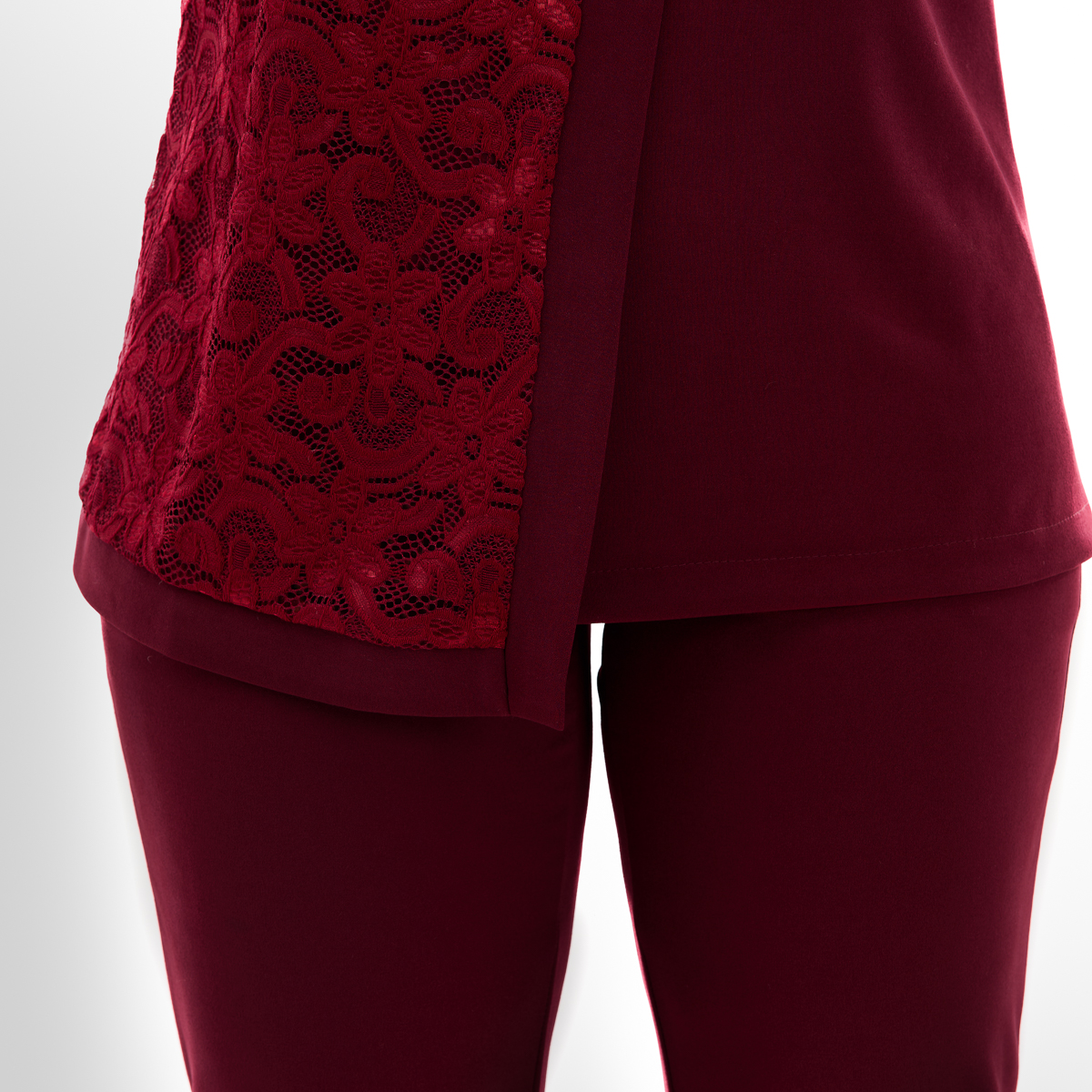 Костюм создан с учётом анатомических особенностей женской фигуры. Блуза с асимметрией и вставками из гипюра визуально вытягивает силуэт и скрывает несовершенства фигуры, создавая огненный и женственный образ. Классические брюки идеально сочетаются с блузой, создают комфорт и превосходный стиль.