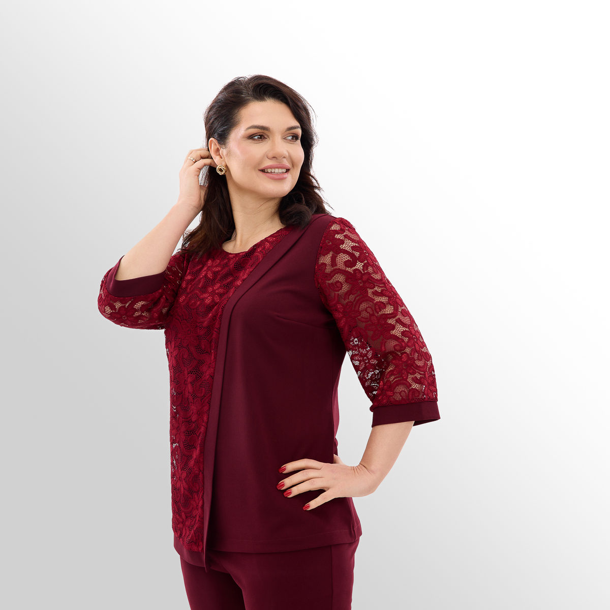 Костюм создан с учётом анатомических особенностей женской фигуры. Блуза с асимметрией и вставками из гипюра визуально вытягивает силуэт и скрывает несовершенства фигуры, создавая огненный и женственный образ. Классические брюки идеально сочетаются с блузой, создают комфорт и превосходный стиль.