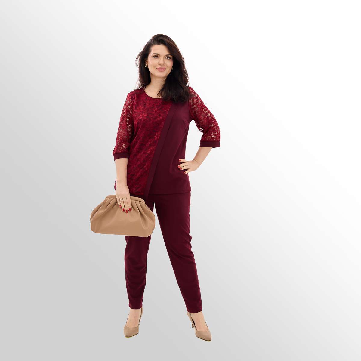 Костюм создан с учётом анатомических особенностей женской фигуры. Блуза с асимметрией и вставками из гипюра визуально вытягивает силуэт и скрывает несовершенства фигуры, создавая огненный и женственный образ. Классические брюки идеально сочетаются с блузой, создают комфорт и превосходный стиль.