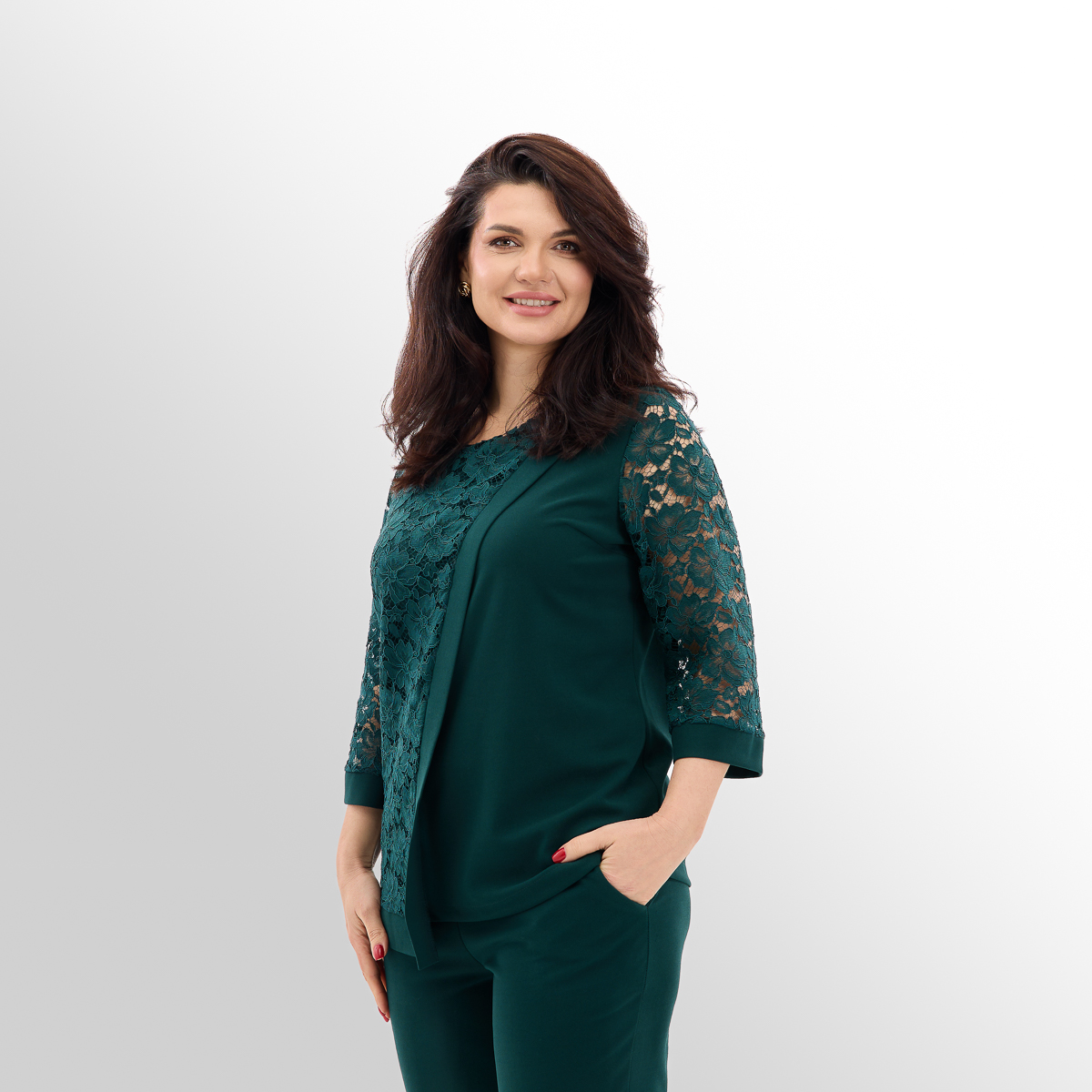 Костюм создан с учётом анатомических особенностей женской фигуры. Блуза с асимметрией и вставками из гипюра визуально вытягивает силуэт и скрывает несовершенства фигуры, создавая огненный и женственный образ. Классические брюки идеально сочетаются с блузой, создают комфорт и превосходный стиль.