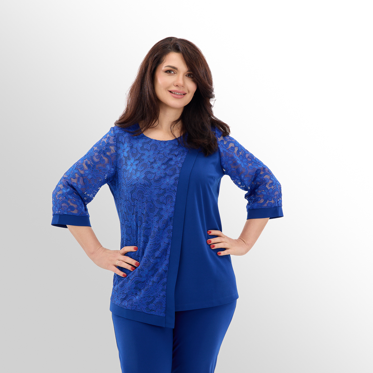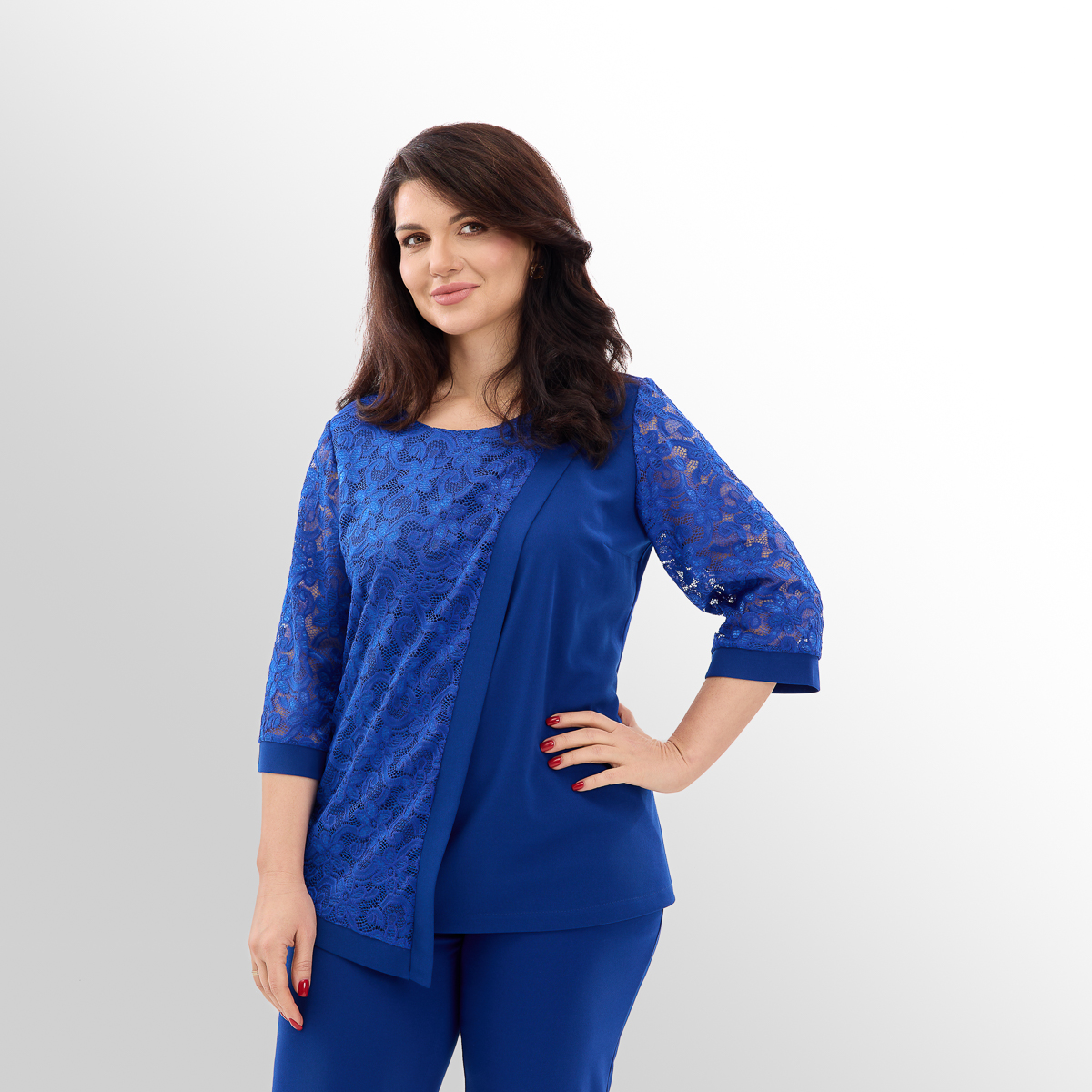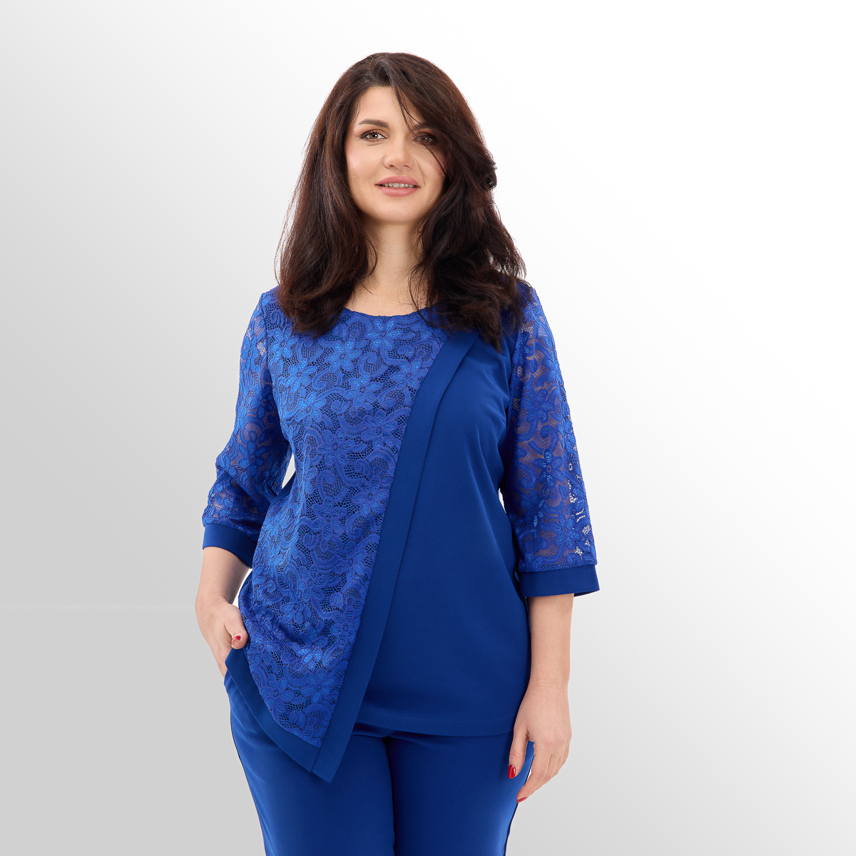 Костюм создан с учётом анатомических особенностей женской фигуры. Блуза с асимметрией и вставками из гипюра визуально вытягивает силуэт и скрывает несовершенства фигуры, создавая огненный и женственный образ. Классические брюки идеально сочетаются с блузой, создают комфорт и превосходный стиль.