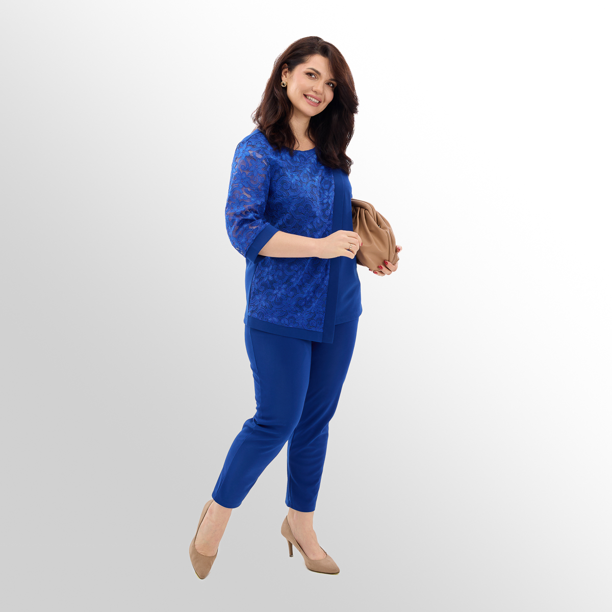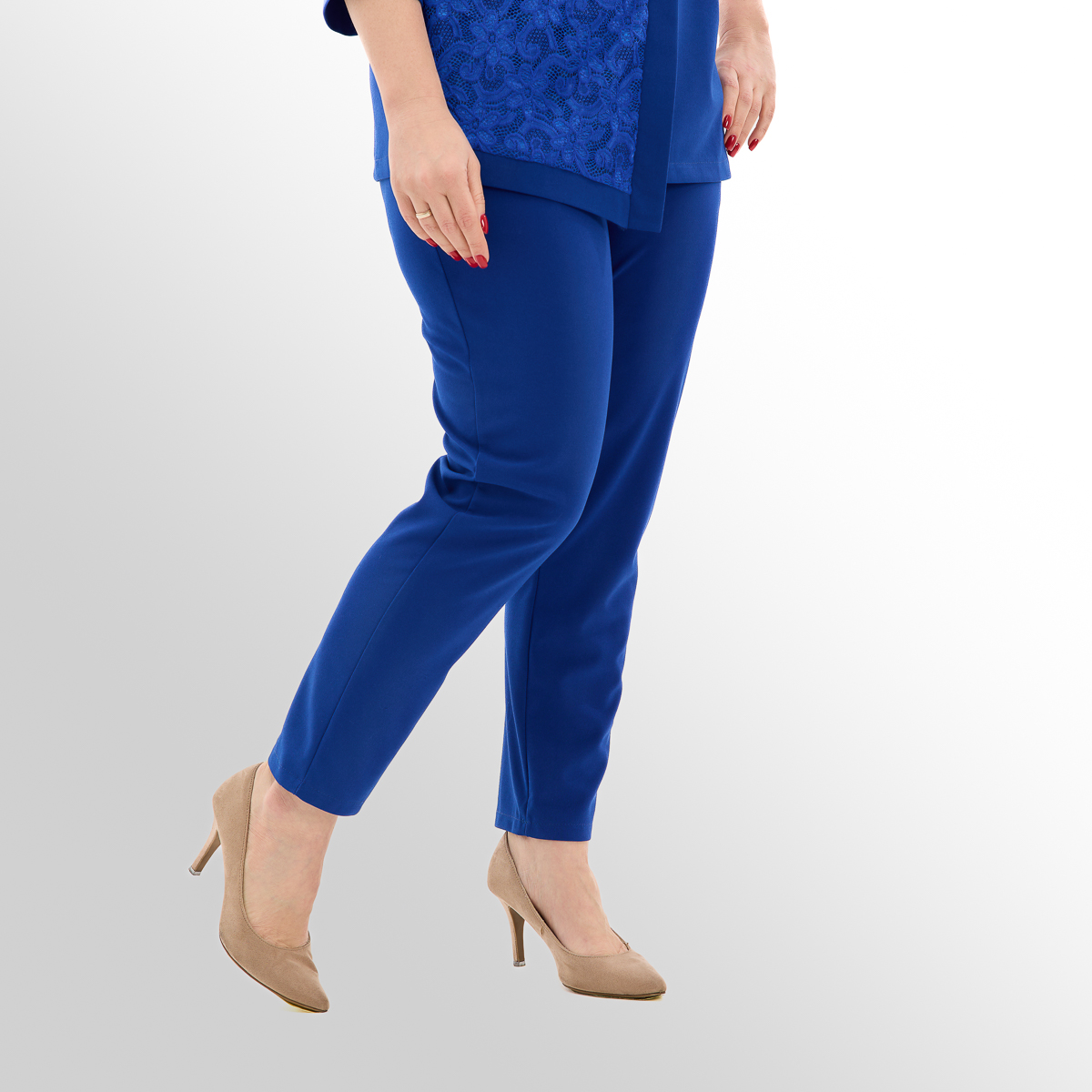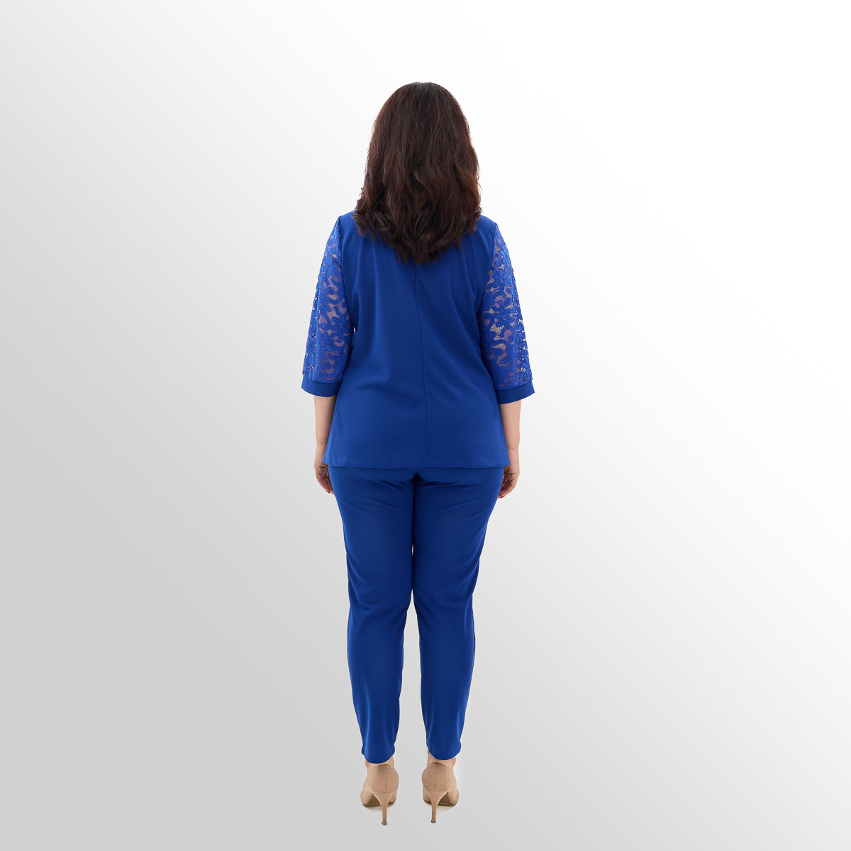 Костюм создан с учётом анатомических особенностей женской фигуры. Блуза с асимметрией и вставками из гипюра визуально вытягивает силуэт и скрывает несовершенства фигуры, создавая огненный и женственный образ. Классические брюки идеально сочетаются с блузой, создают комфорт и превосходный стиль.