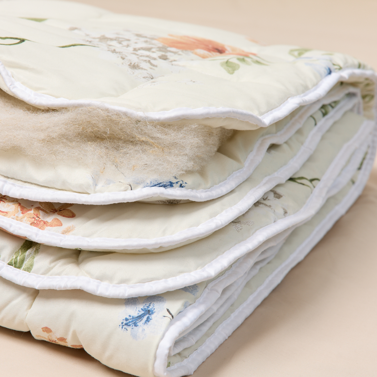 Благодаря натуральным шерстяным волокнам, одеяло регулирует температуру, предотвращает перегрев и создает уютное тепло зимой и комфортную прохладу летом.