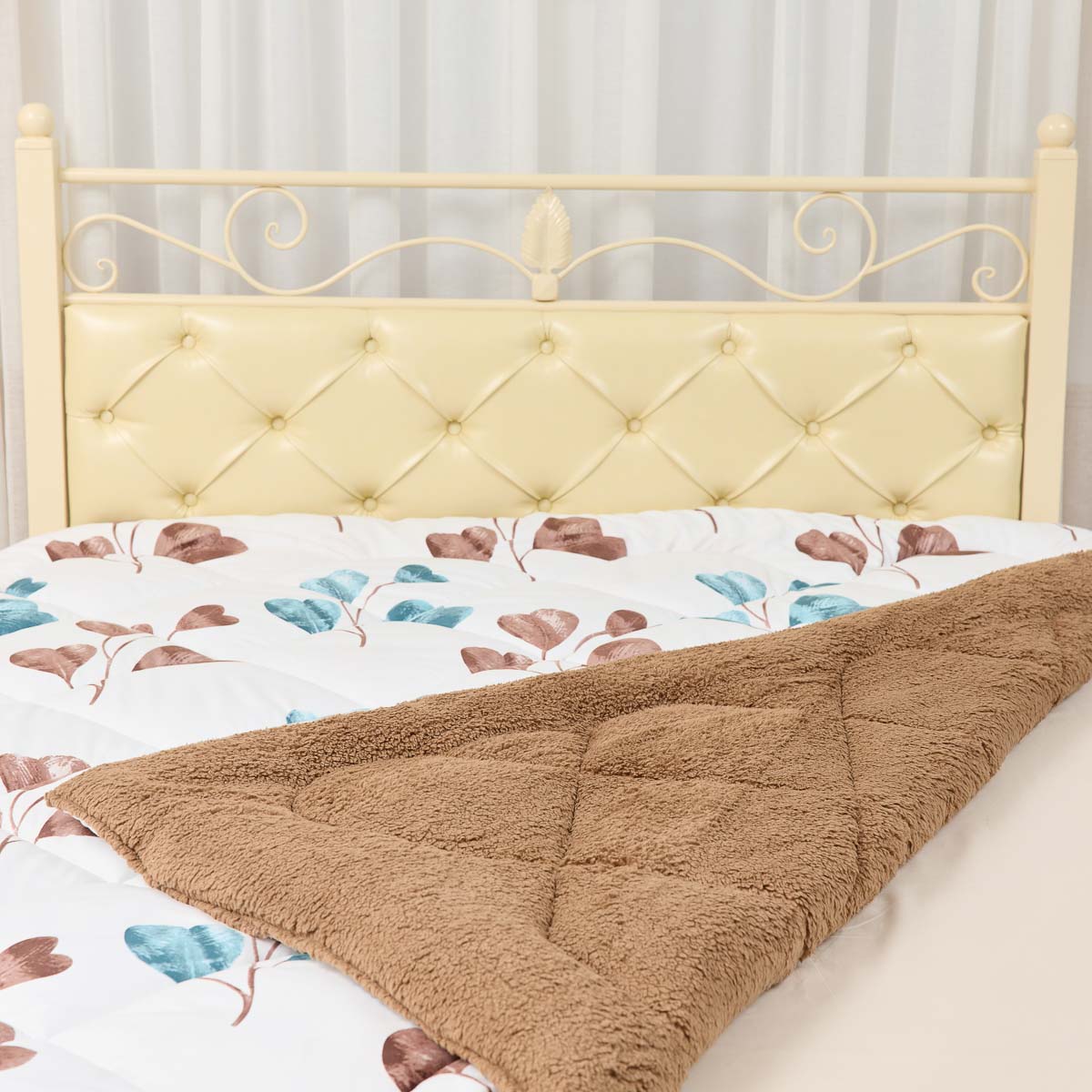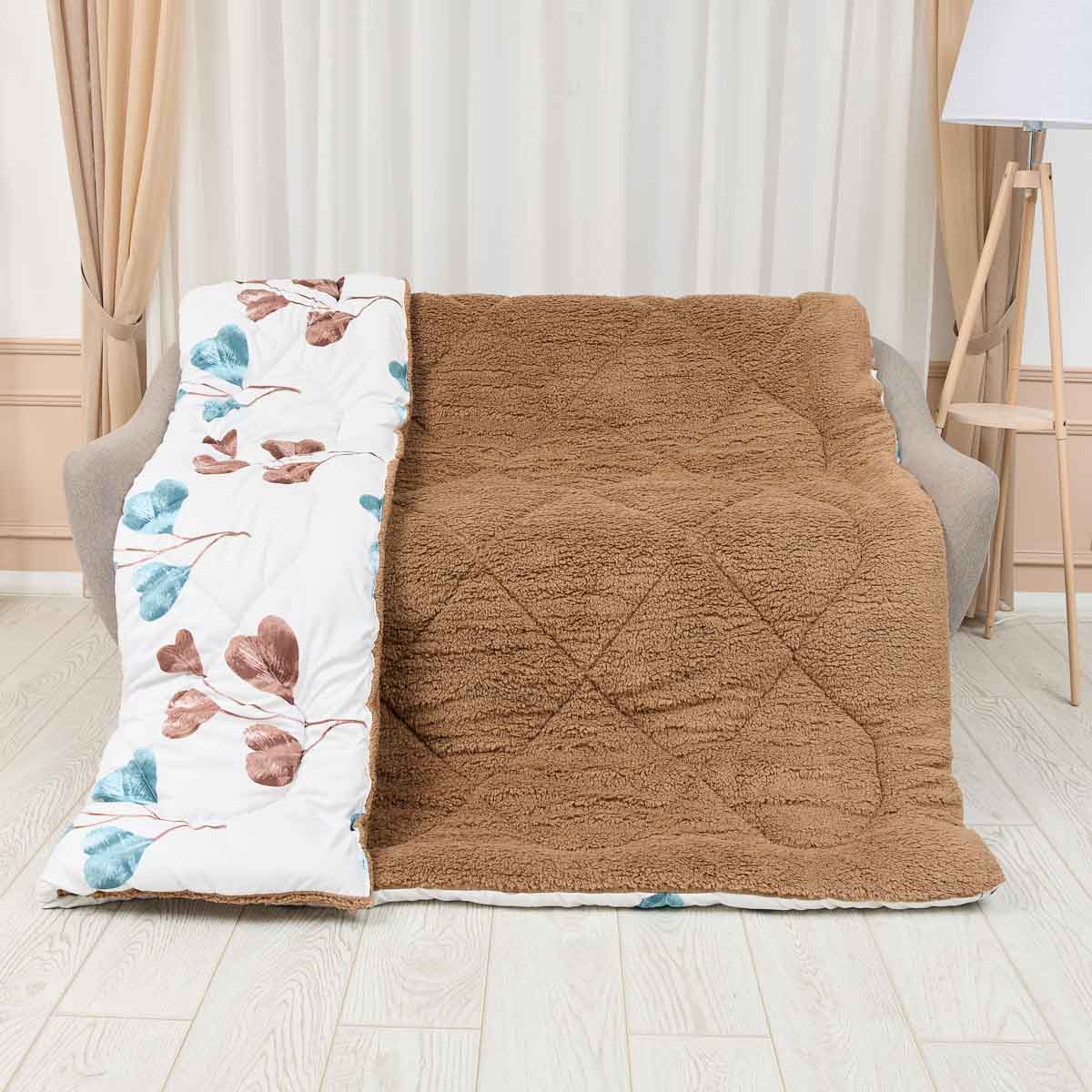 Двусторонняя зимняя одеяло, одна поверхность полиэстер, вторая поверхность шерсть. Можно использовать как покрывало на кровать, как теплое одеяло, как накидку на мебель. Очень теплое. Нравится детям.