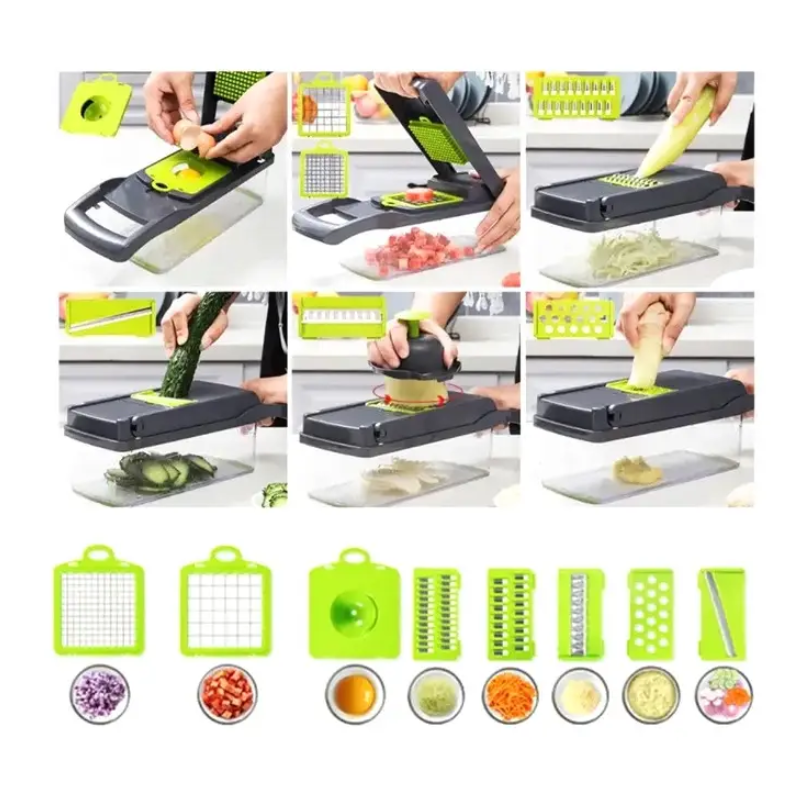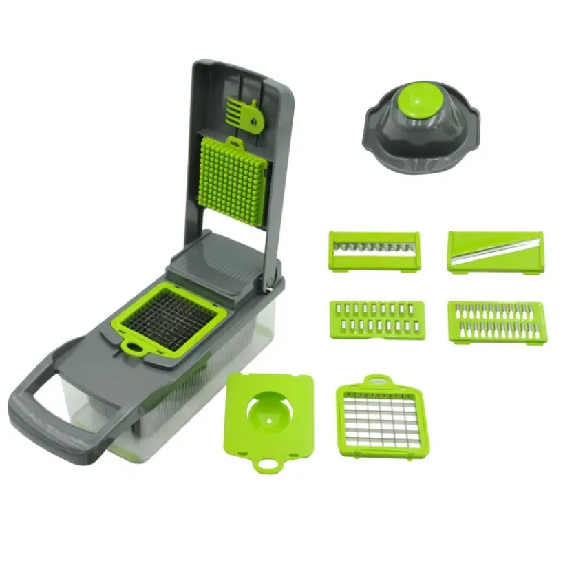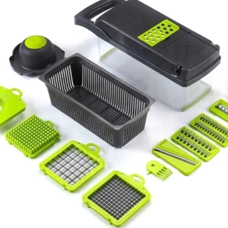 ПРЕИМУЩЕСТВА ОВОЩЕРЕЗКИ: многофункциональное кухонное устройство сочетает в себе функции слайсера, терки и овощерезки. Оно позволяет быстро нарезать кубиками овощи и фрукты для салата, натереть овощи для супа и нарезать фрукты на десерт. Оснащен сменными лезвиями из нержавеющей стали. Слайсер с измельчителем легко чистится. Просто положите его в посудомоечную машину! Материал не содержит бисфенола.