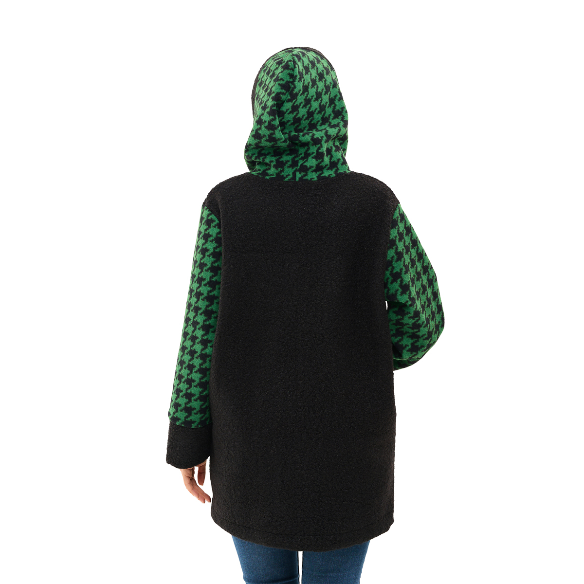Модель удлинённая и комбинированная с чёрным эко-мехом «барашек», что создаёт эффектный контраст фактур. В комбинированном варианте чёрная ткань на спинке и рукавах выполнена из эко-меха «барашек», а основная часть пальто — из кашемира. Такое сочетание делает изделие не только эффектным, но и тёплым, приятным на ощупь. Пальто дополнено удобными вместительными карманами и комфортным глубоким капюшоном, который защитит от ветра и холода. Доступные цвета — бежевый, зелёный, мокко и чёрно-белый, что позволяет выбрать вариант под любой стиль и настроение.