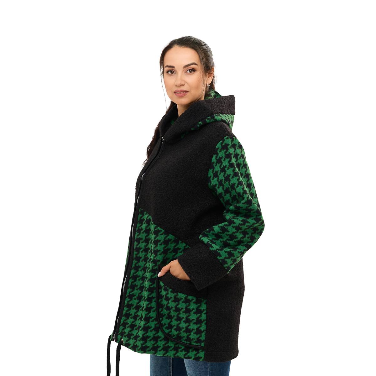 Модель удлинённая и комбинированная с чёрным эко-мехом «барашек», что создаёт эффектный контраст фактур. В комбинированном варианте чёрная ткань на спинке и рукавах выполнена из эко-меха «барашек», а основная часть пальто — из кашемира. Такое сочетание делает изделие не только эффектным, но и тёплым, приятным на ощупь. Пальто дополнено удобными вместительными карманами и комфортным глубоким капюшоном, который защитит от ветра и холода. Доступные цвета — бежевый, зелёный, мокко и чёрно-белый, что позволяет выбрать вариант под любой стиль и настроение.