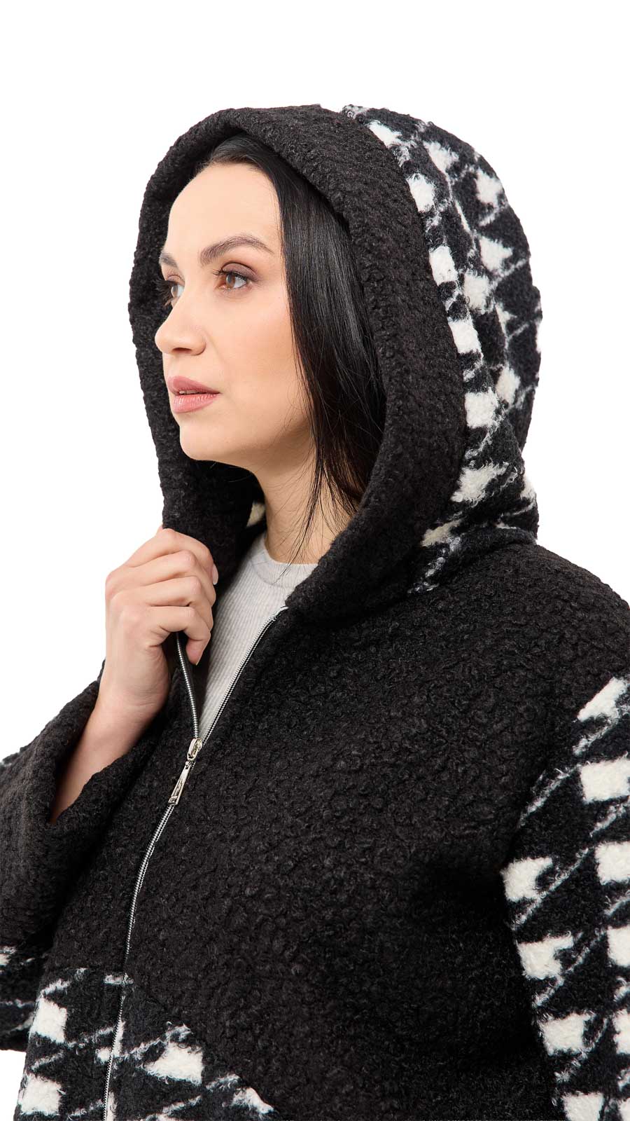 Модель удлинённая и комбинированная с чёрным эко-мехом «барашек», что создаёт эффектный контраст фактур. В комбинированном варианте чёрная ткань на спинке и рукавах выполнена из эко-меха «барашек», а основная часть пальто — из кашемира. Такое сочетание делает изделие не только эффектным, но и тёплым, приятным на ощупь. Пальто дополнено удобными вместительными карманами и комфортным глубоким капюшоном, который защитит от ветра и холода. Доступные цвета — бежевый, зелёный, мокко и чёрно-белый, что позволяет выбрать вариант под любой стиль и настроение.