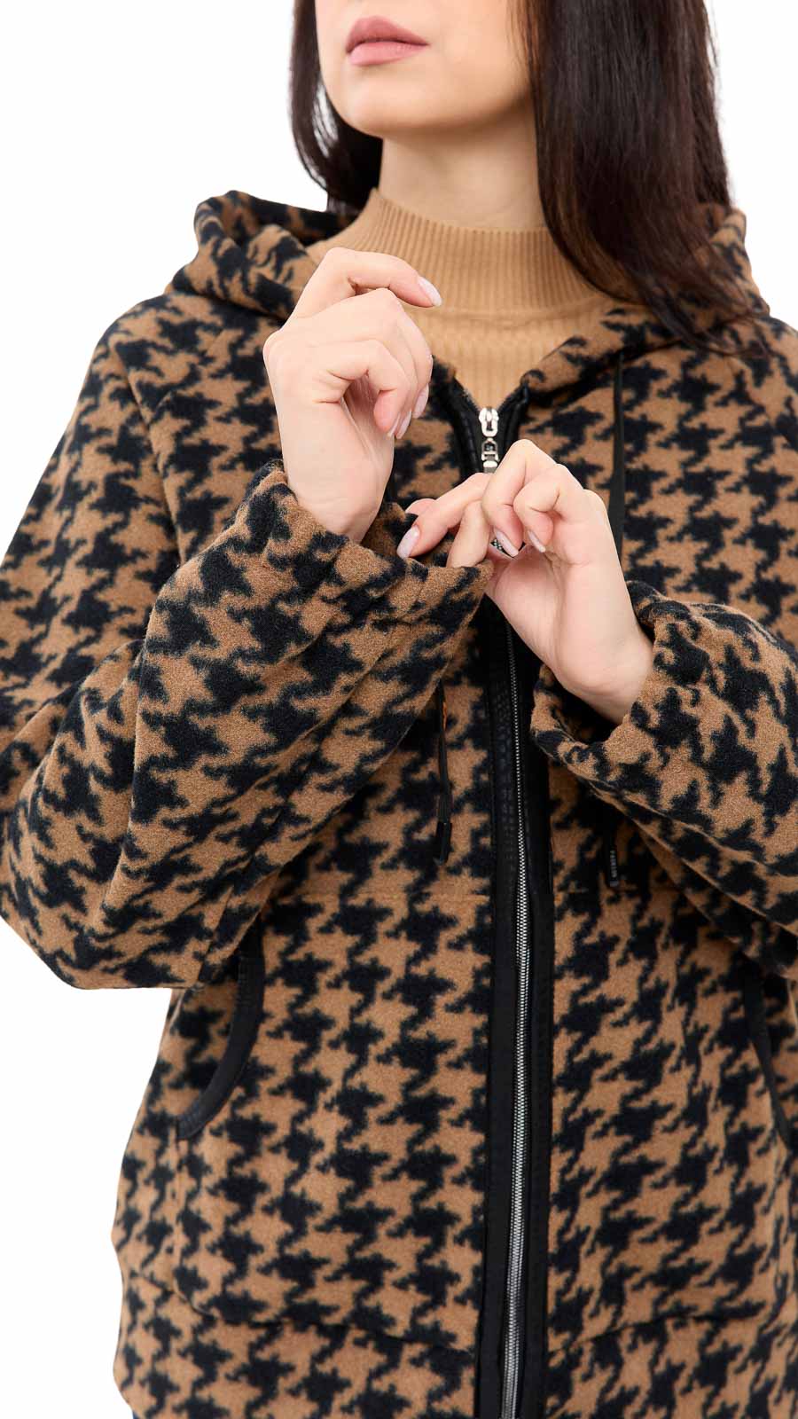 Доступные цвета — чёрно-белый, зелёный и мокко — позволяют подобрать вариант под настроение и стиль. Классический рисунок «гусиные лапки» добавляет образу интеллектуальной элегантности, а укороченный крой делает модель более динамичной и современной. Размерный ряд 48–58 обеспечивает комфортную посадку и отлично подходит для разных типов фигуры. Пальто красиво смотрится как с классическими брюками, так и с укороченными моделями или брюками 7/8, создавая гармоничный и стильный силуэт. Его легко сочетать с ботильонами, сапогами или лоферами — образ всегда будет выглядеть завершённым.