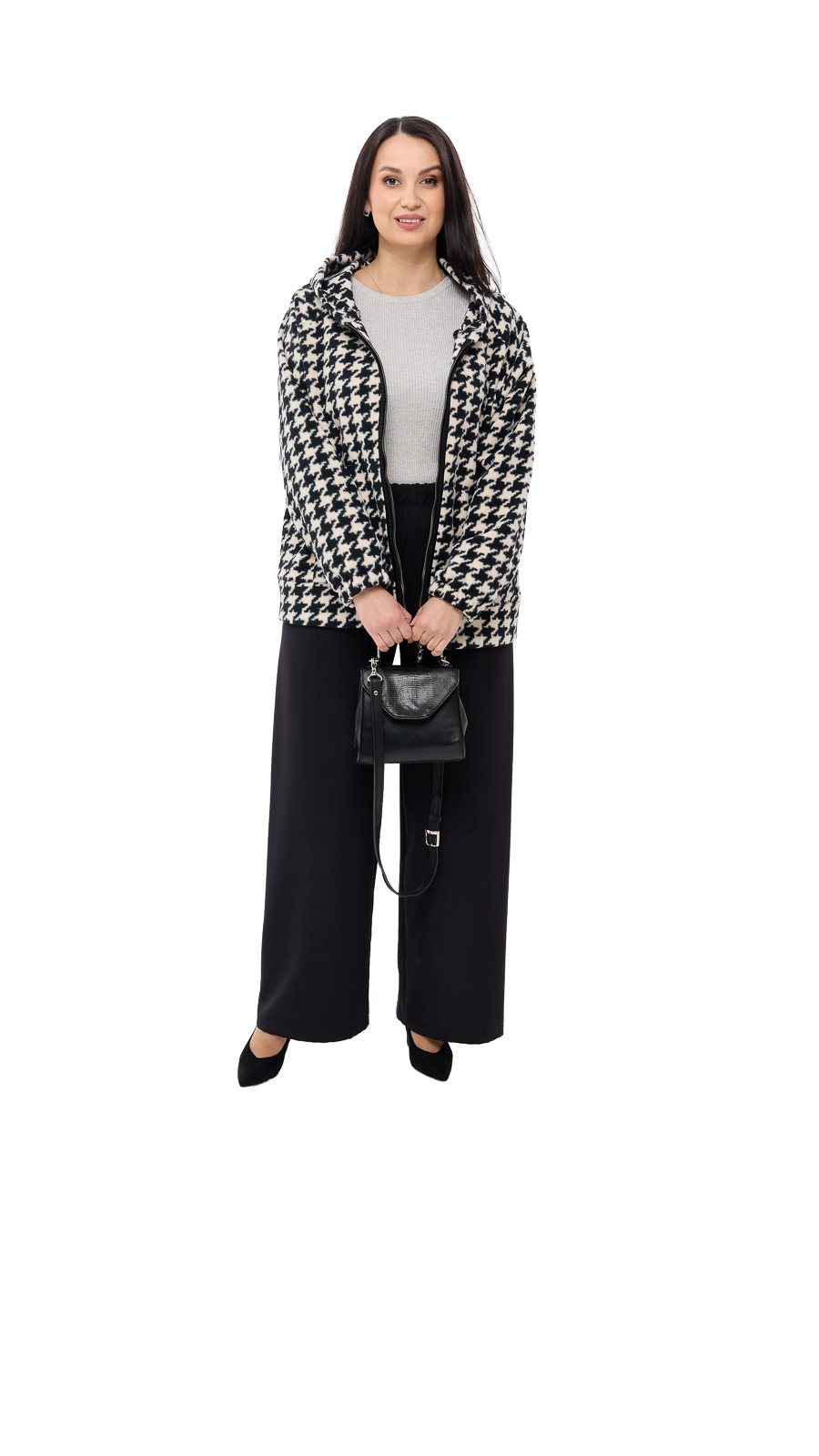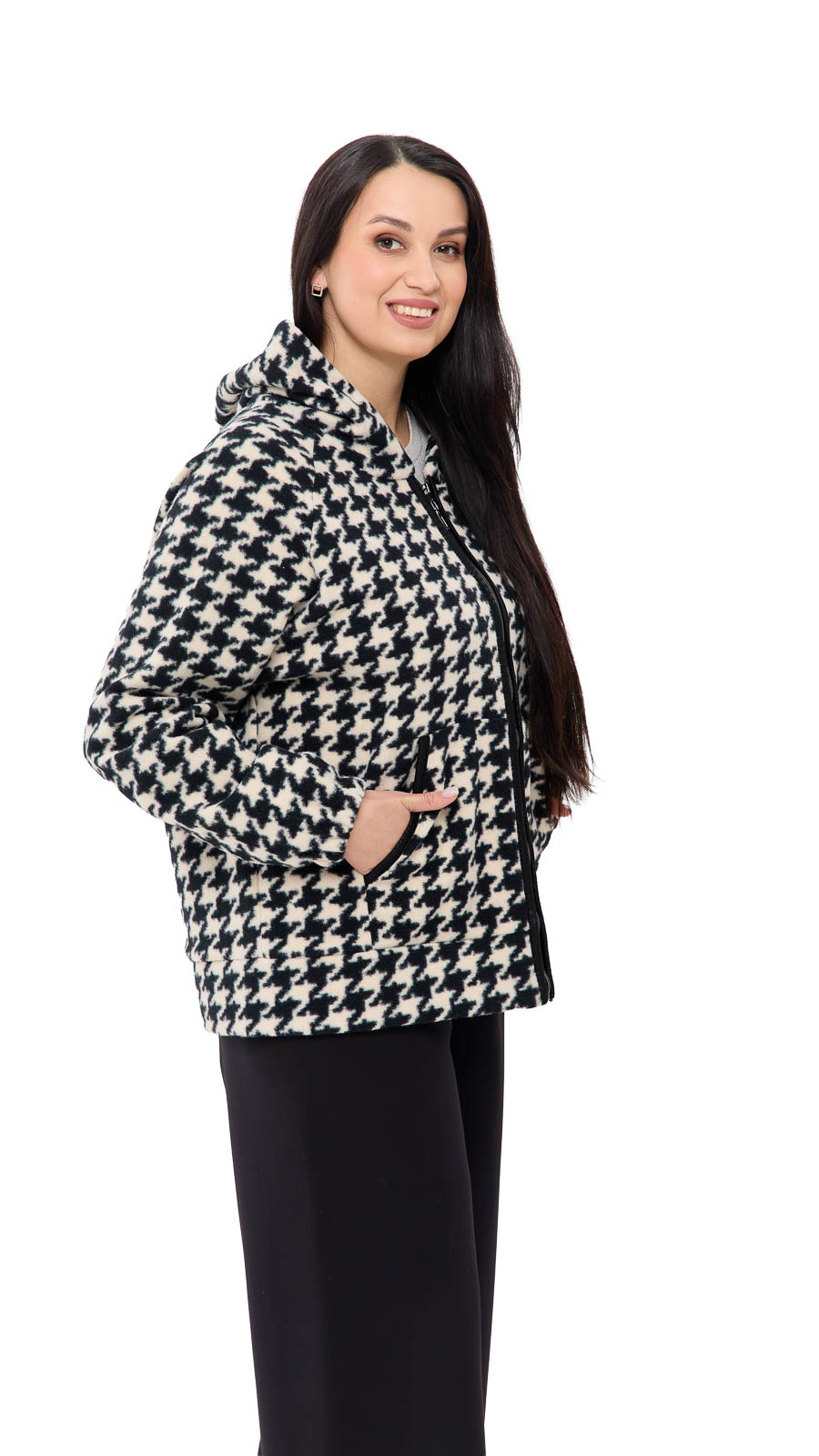 Доступные цвета — чёрно-белый, зелёный и мокко — позволяют подобрать вариант под настроение и стиль. Классический рисунок «гусиные лапки» добавляет образу интеллектуальной элегантности, а укороченный крой делает модель более динамичной и современной. Размерный ряд 48–58 обеспечивает комфортную посадку и отлично подходит для разных типов фигуры. Пальто красиво смотрится как с классическими брюками, так и с укороченными моделями или брюками 7/8, создавая гармоничный и стильный силуэт. Его легко сочетать с ботильонами, сапогами или лоферами — образ всегда будет выглядеть завершённым.