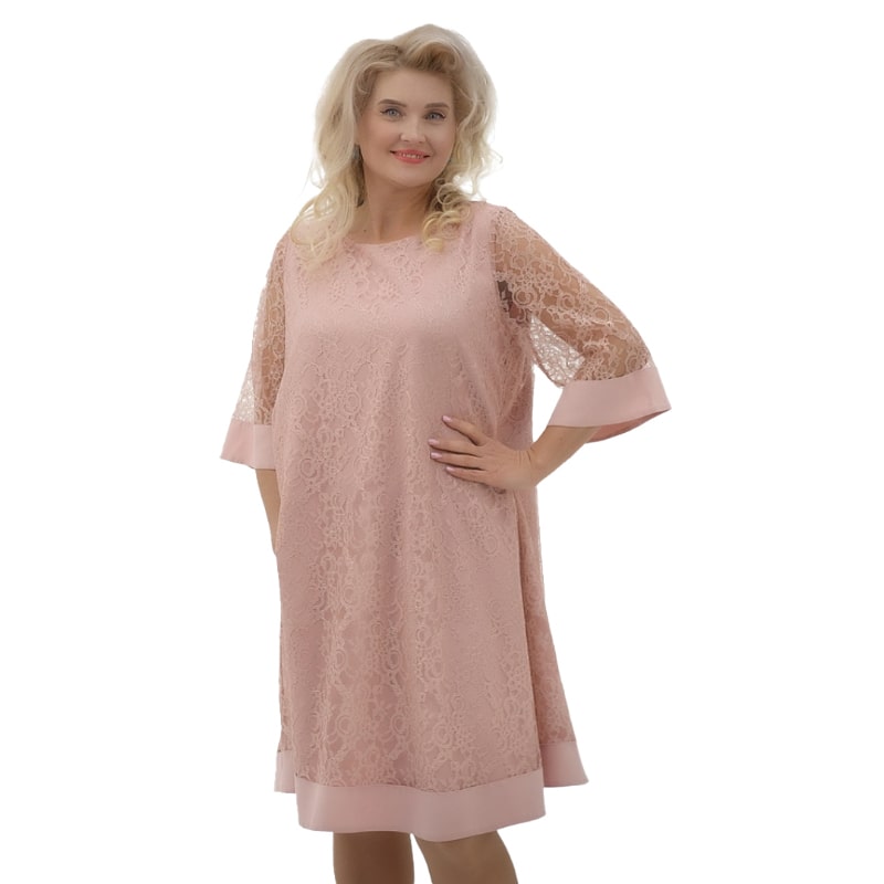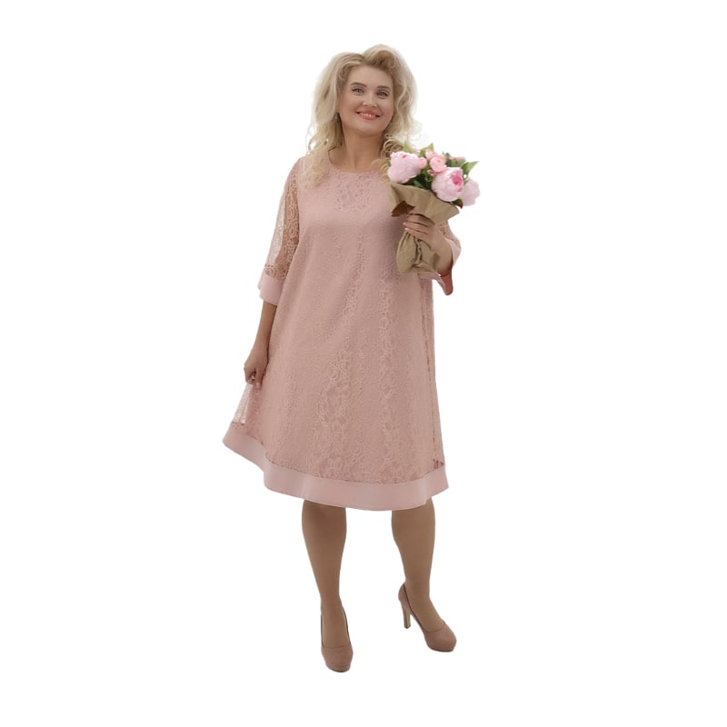 Использование итальянского премиального трикотажа в сочетании с гипюрной отделкой придает этому платью особенный шарм и элегантность. Гипюр делает образ свежим и легким, подчеркивая хрупкость и женственность фигуры, в то время как трикотаж обеспечивает идеальную посадку. Платье представлено в двух классических цветах: черном и пудровом, а также доступно в размерах до 56.