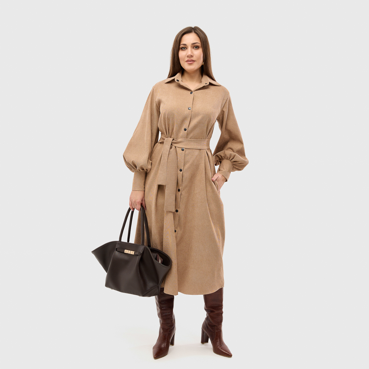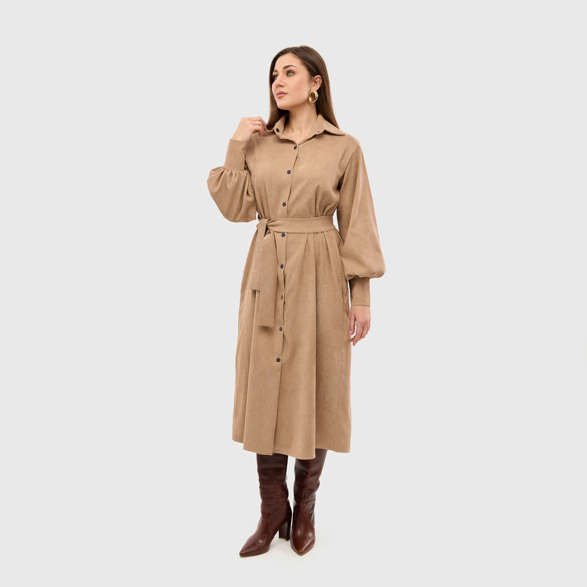 Идеальное сочетание классики и современных деталей. Платье выполнено с классическим воротником, манжетами на рукавах и застежками-кнопками, которые делают образ элегантным и стильным. Наличие пояса подчеркивает талию, создавая женственный силуэт.