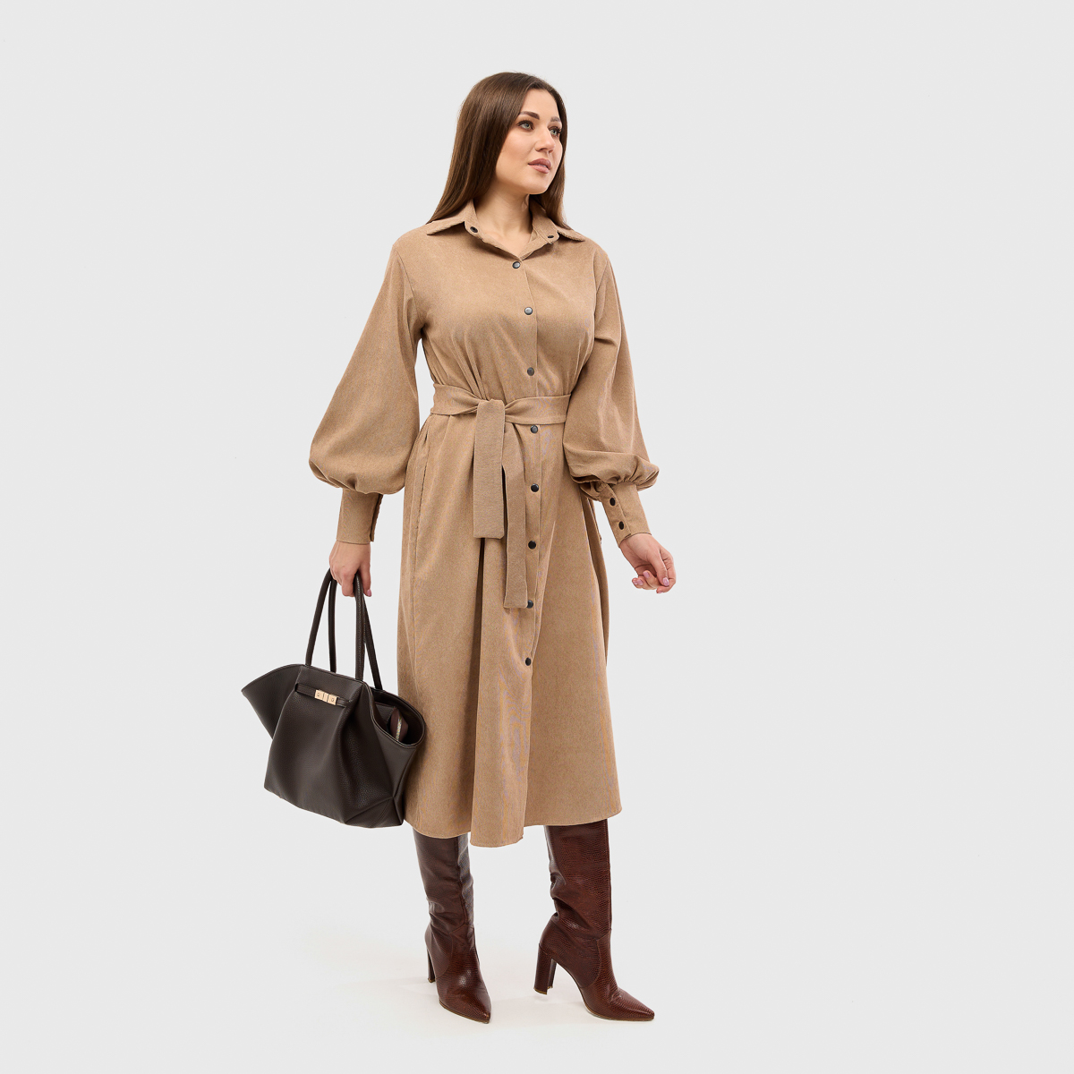 Идеальное сочетание классики и современных деталей. Платье выполнено с классическим воротником, манжетами на рукавах и застежками-кнопками, которые делают образ элегантным и стильным. Наличие пояса подчеркивает талию, создавая женственный силуэт.