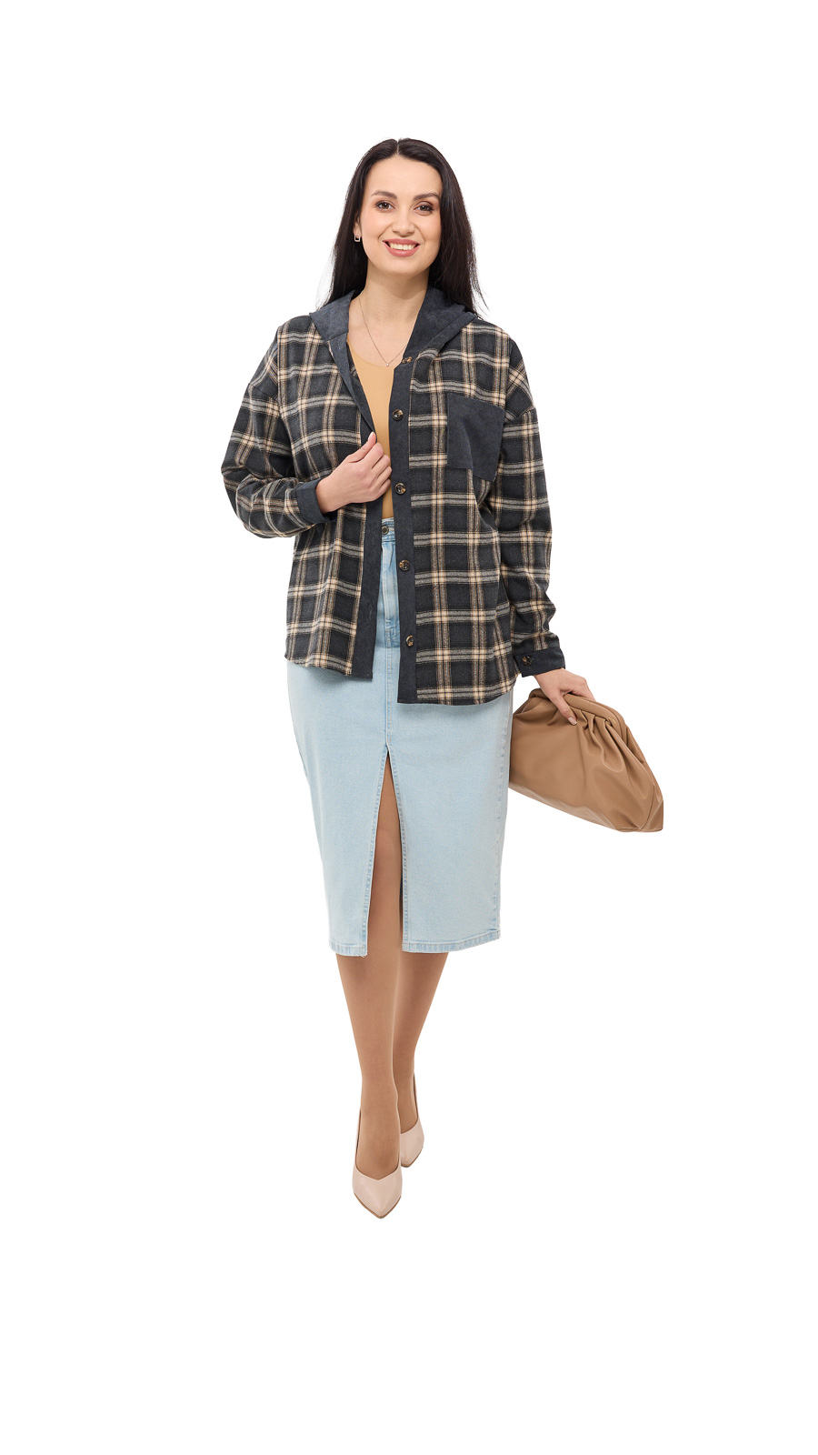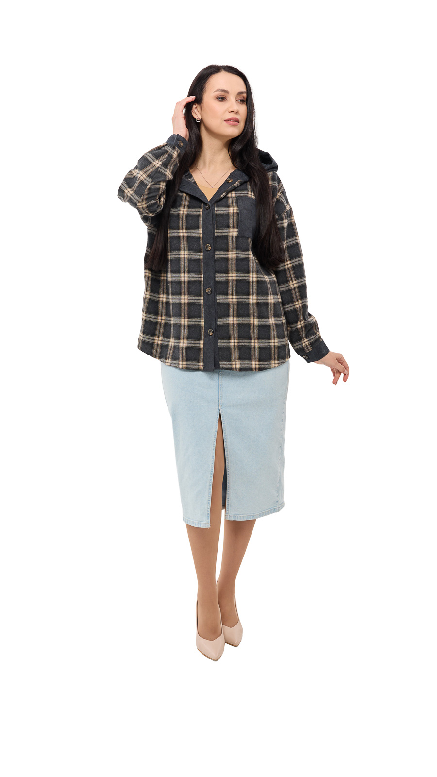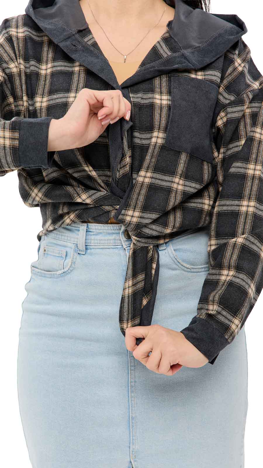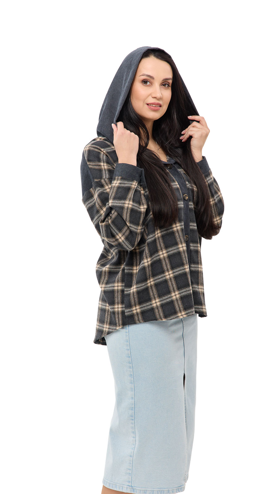 Особый акцент — капюшон, который добавляет образу спортивно-casual настроение и делает вещь ещё более практичной в прохладную погоду. Клетчатый принт выглядит стильно и универсально, а вставки из вельвета (на капюшоне/элементах отделки) добавляют фактурности и “дорогого” вида. Рубашку Мелли можно носить как самостоятельный верх или как лёгкую накидку поверх футболки или топа — она отлично сочетается с джинсами, леггинсами и кроссовками.
