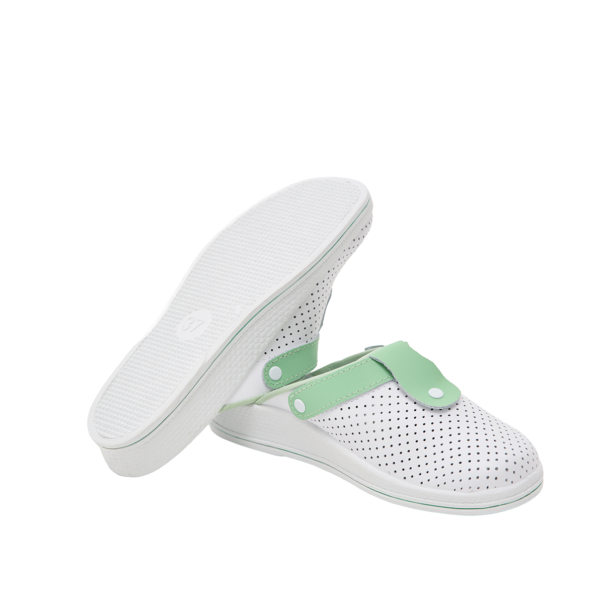 Сабо Симона – это элегантный европейский стиль, качественная итальянская кожа и неописуемый комфорт анатомической стельки! Редкое сочетание красоты и удобства! Сабо отлично сочетается как с элегантной, так и с повседневной одеждой! Просто выбирайте классический белый цвет или изюминку в виде изумрудного декора!