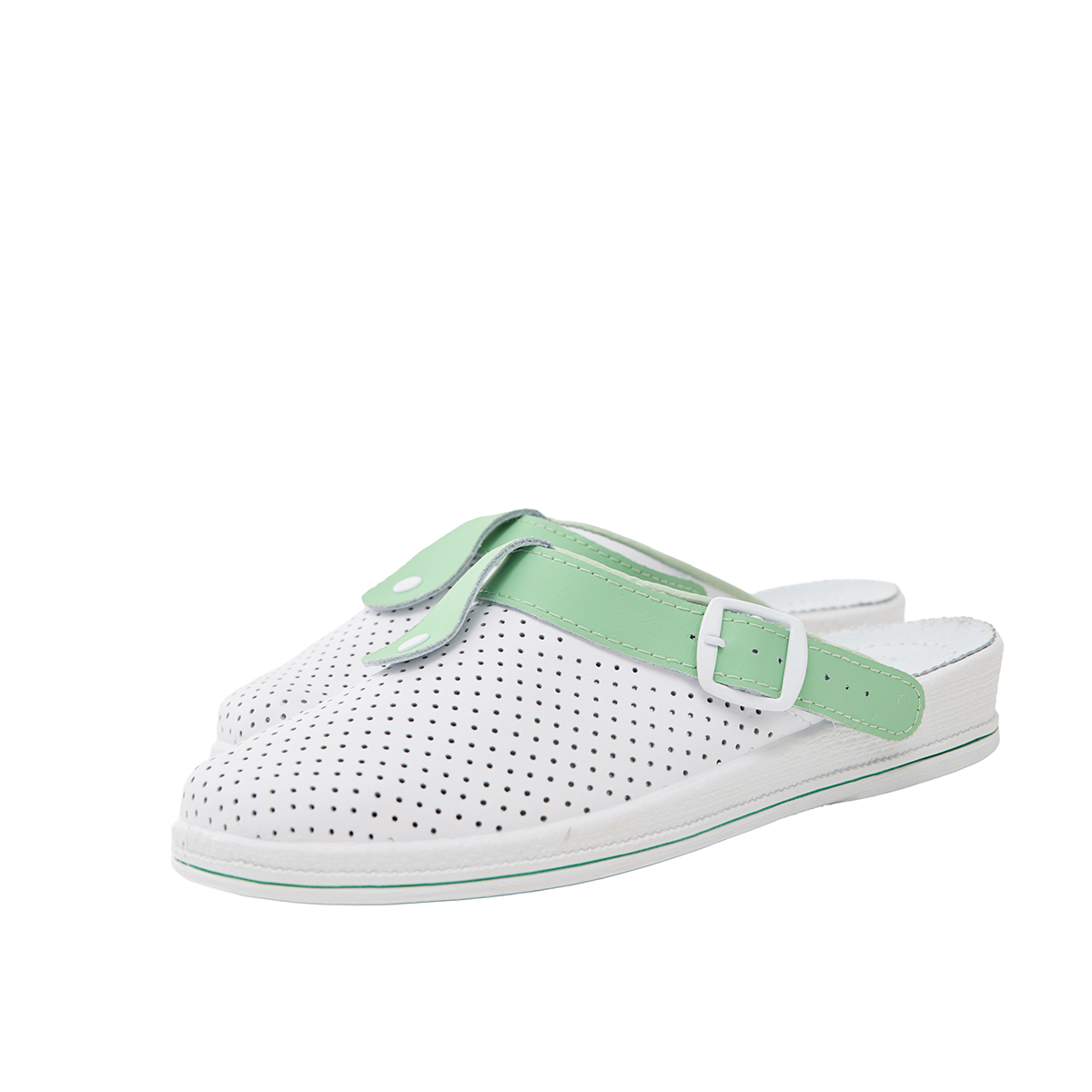 Сабо Симона – это элегантный европейский стиль, качественная итальянская кожа и неописуемый комфорт анатомической стельки! Редкое сочетание красоты и удобства! Сабо отлично сочетается как с элегантной, так и с повседневной одеждой! Просто выбирайте классический белый цвет или изюминку в виде изумрудного декора!