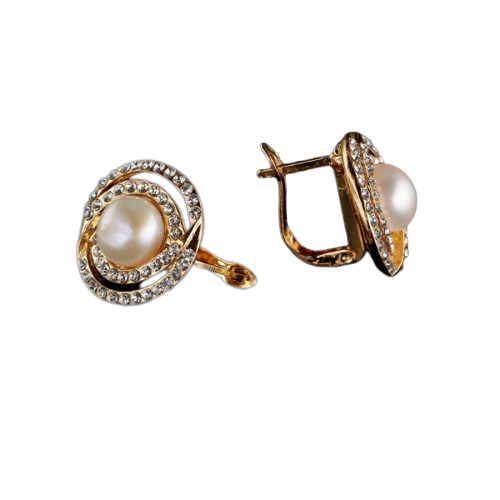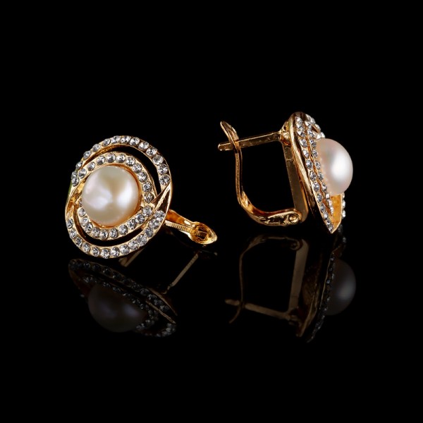Серьги выполнены с 24 каратным золотым покрытием, искусственным жемчугом и стразами. Они оснащены английским замком, что делает их невероятно удобными и комфортными, благодаря чему они пользуются популярностью у женского пола.