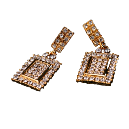 Украшение выполнено с 18-каратным золотым покрытием, серьги орнаментированы кристаллами. Длина серьги составляет 3 см. Декоративный элемент (прямоугольник) имеет размеры 1,5*1,2 см.