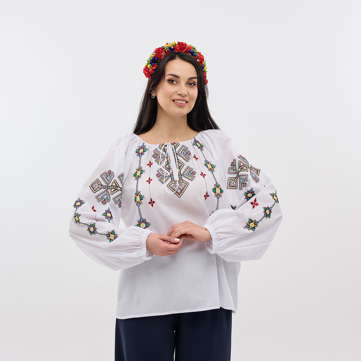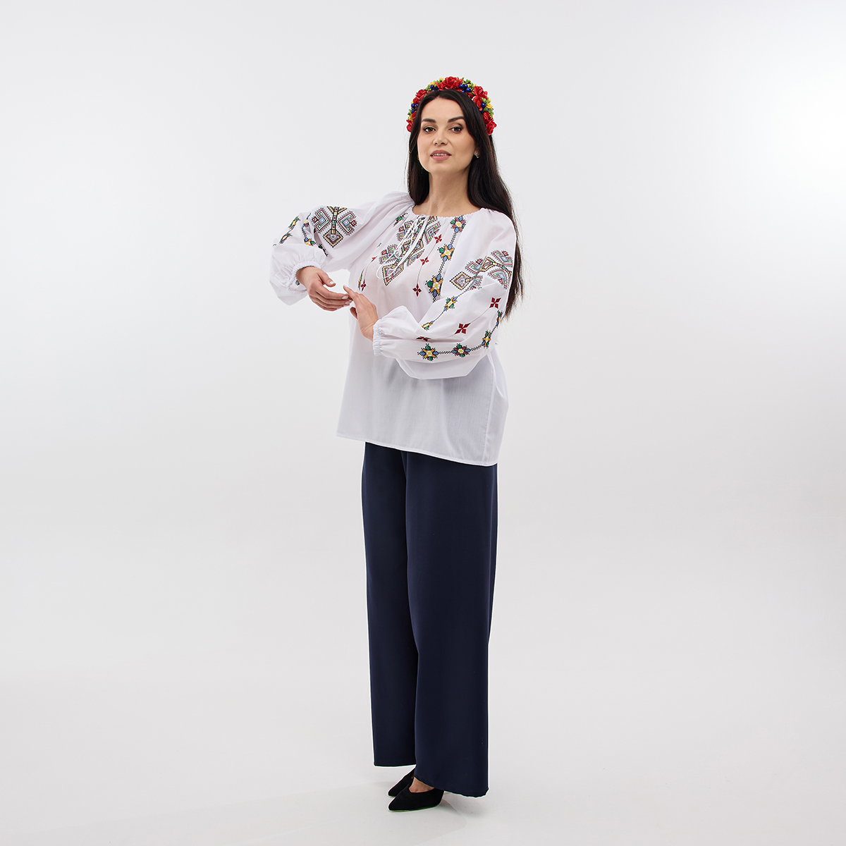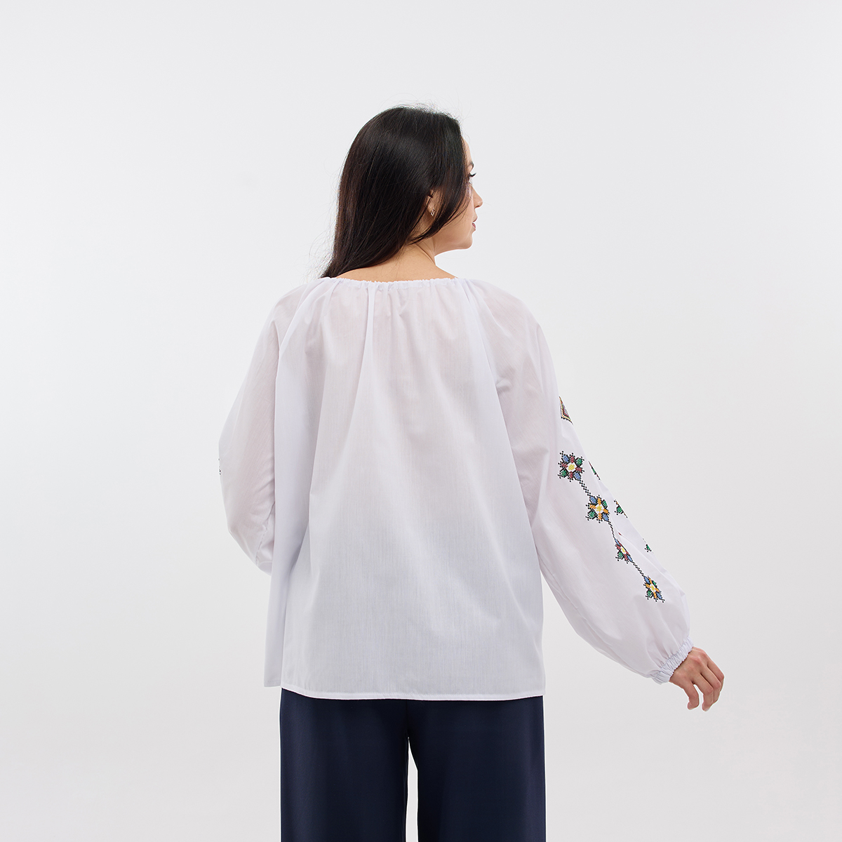 Рубашка Зореслава станет вашим любимым элементом гардероба! Ее можно сочетать как с классическими, так и с современными образами. Крой-трапеция выгодно подчеркнет фигуру. Комфорт в каждом движении! Рукава-фонарики с элегантной застежкой на пуговицу. Придадут образу особой грации! Изысканный воротничок-стойка добавляет рубашке благородного вида. Обратите внимание на изящную украинскую вышивку! Каждый узор полон глубокого смысла. Премиальная натуральная ткань! Обеспечит комфорт и долговечность! В наличии молочный, белый и черный цвета. Широкий размерный ряд!