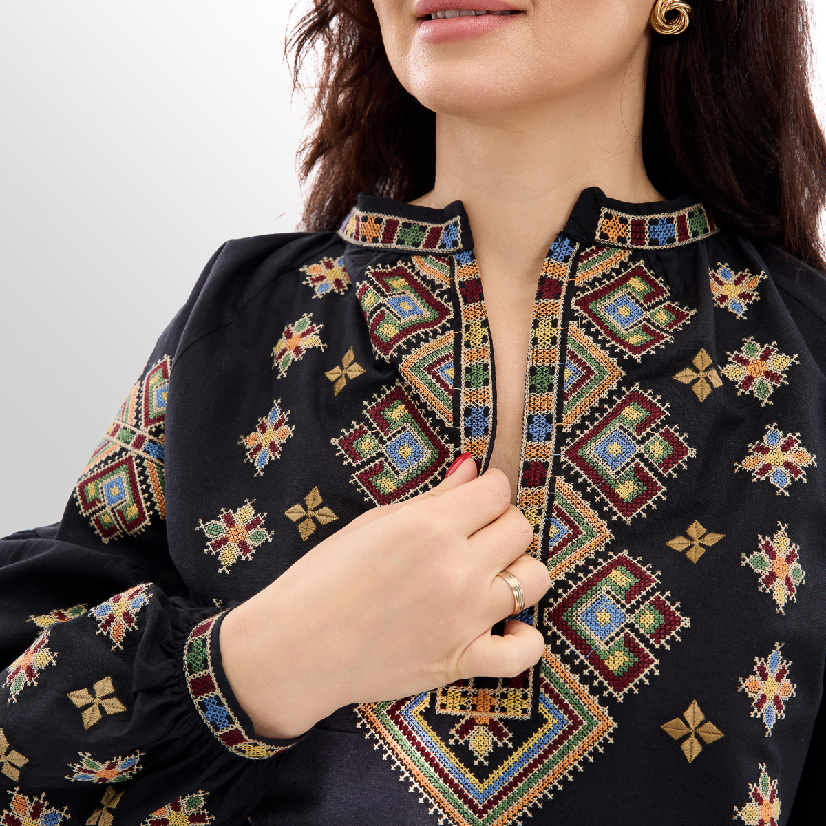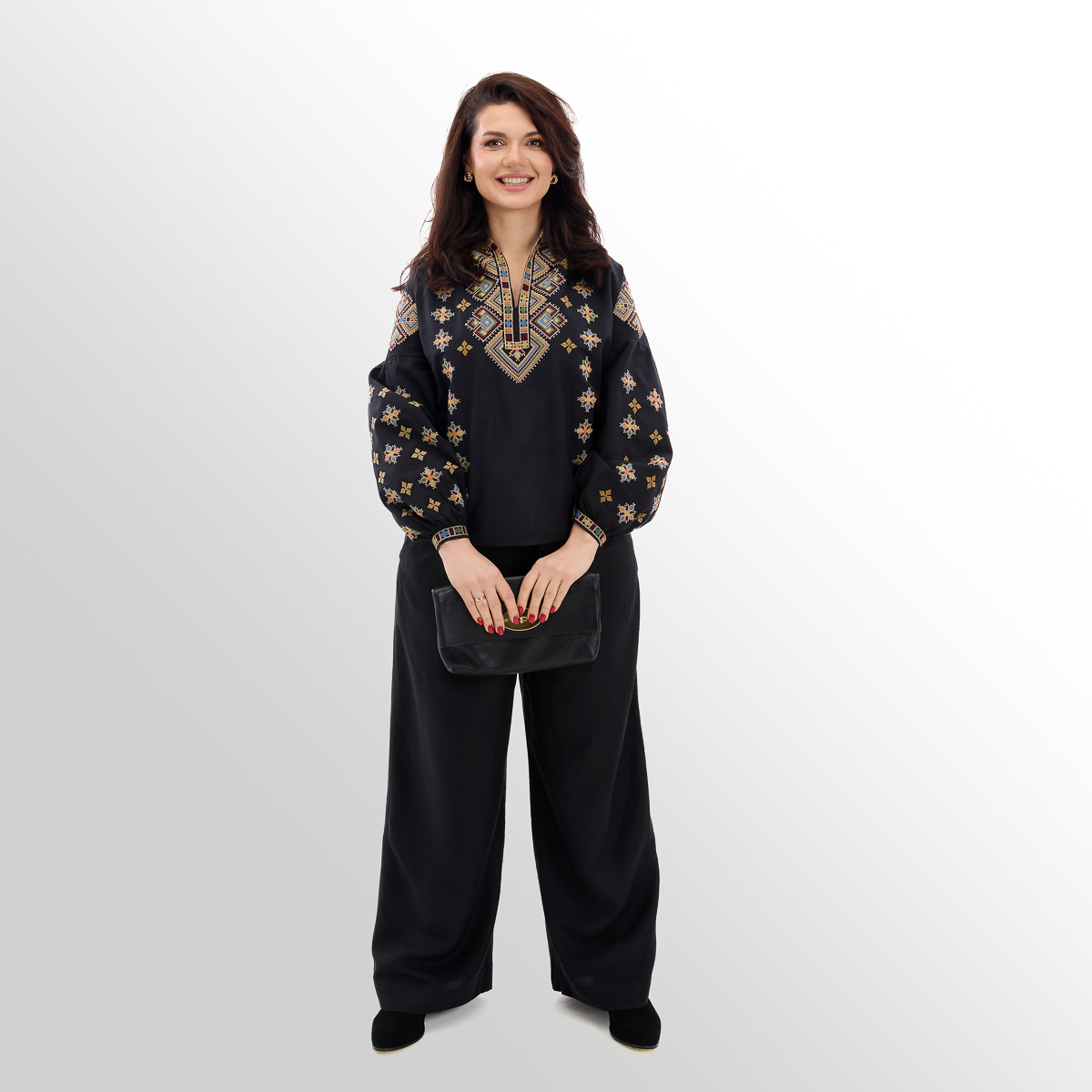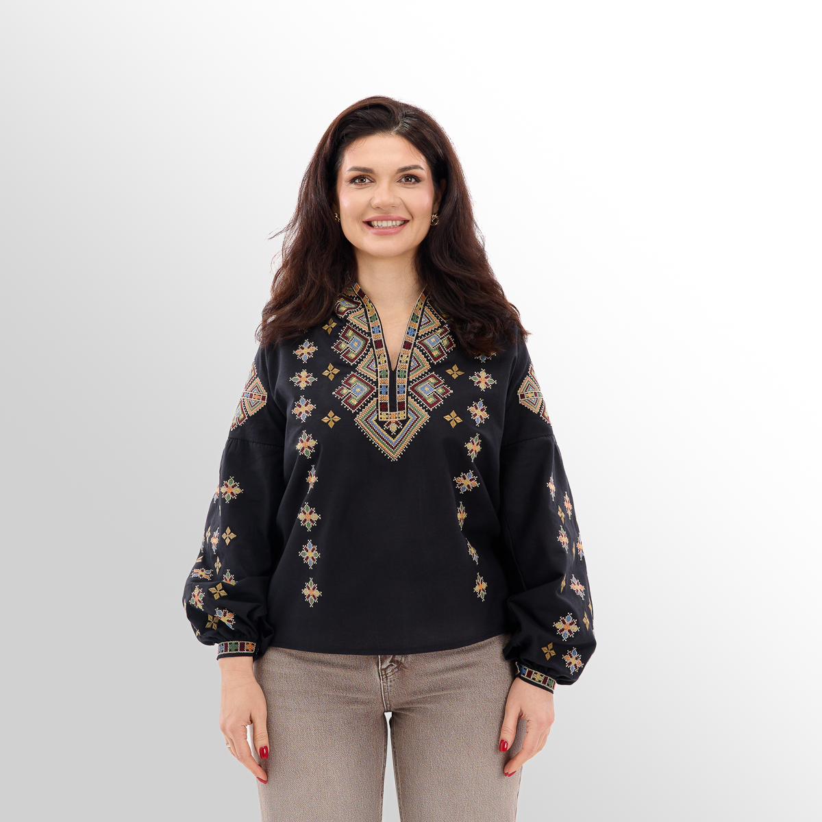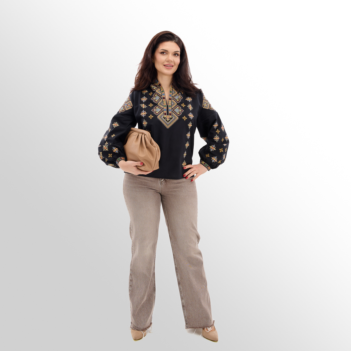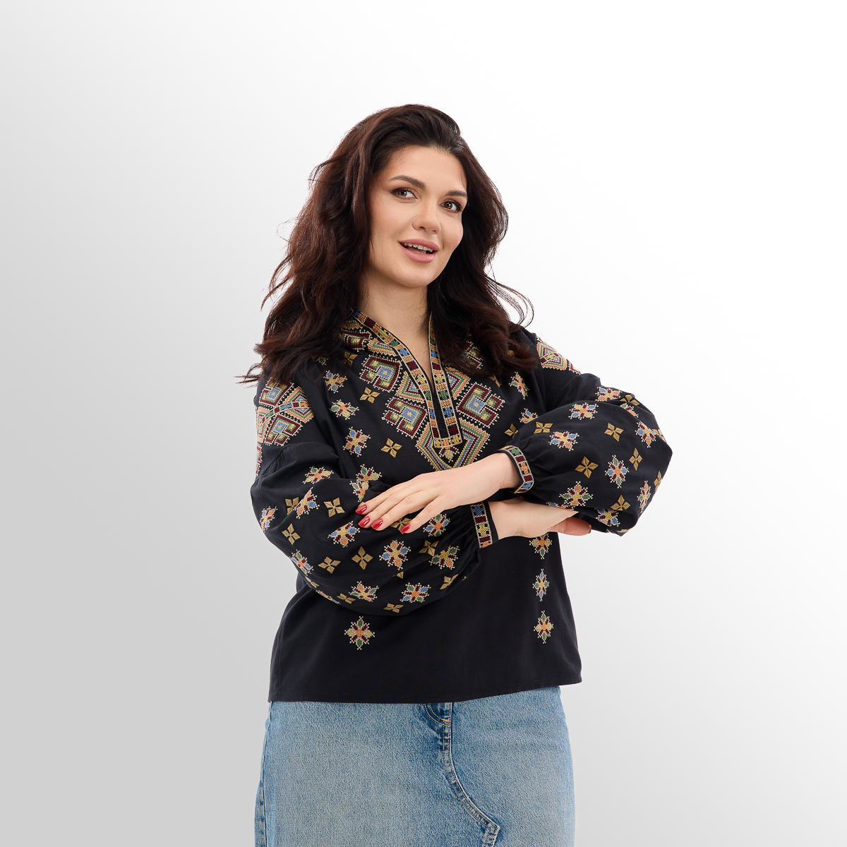 Рубашка Зореслава станет вашим любимым элементом гардероба! Ее можно сочетать как с классическими, так и с современными образами. Крой-трапеция выгодно подчеркнет фигуру. Комфорт в каждом движении! Рукава-фонарики с элегантной застежкой на пуговицу. Придадут образу особой грации! Изысканный воротничок-стойка добавляет рубашке благородного вида. Обратите внимание на изящную украинскую вышивку! Каждый узор полон глубокого смысла. Премиальная натуральная ткань! Обеспечит комфорт и долговечность! В наличии молочный, белый и черный цвета. Широкий размерный ряд!