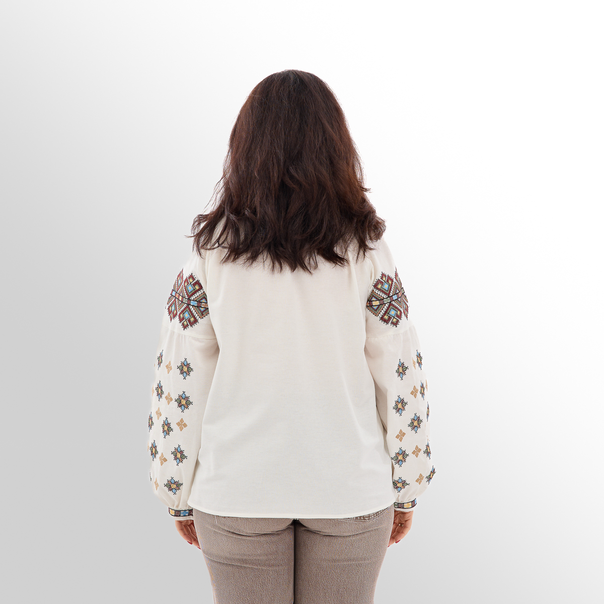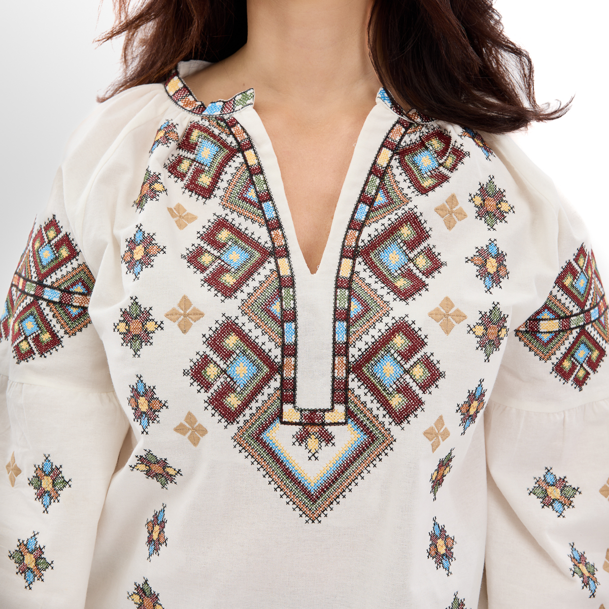 Рубашка Зореслава станет вашим любимым элементом гардероба! Ее можно сочетать как с классическими, так и с современными образами. Крой-трапеция выгодно подчеркнет фигуру. Комфорт в каждом движении! Рукава-фонарики с элегантной застежкой на пуговицу. Придадут образу особой грации! Изысканный воротничок-стойка добавляет рубашке благородного вида. Обратите внимание на изящную украинскую вышивку! Каждый узор полон глубокого смысла. Премиальная натуральная ткань! Обеспечит комфорт и долговечность! В наличии молочный, белый и черный цвета. Широкий размерный ряд!