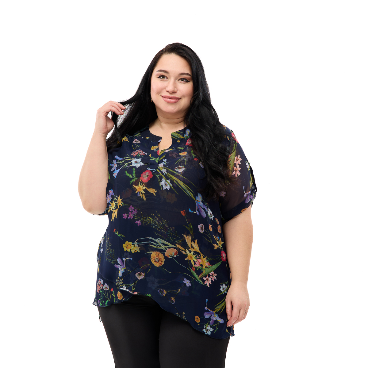 Нежный шифон на основе шелка изящно спадает по фигуре! Образ невероятно легкий и женственный. Стильный цветочный принт освежает и омолаживает! При этом всегда будет в моде! На выбор множество вариантов! И такой необычный крой! Эффект запаха внизу и регулируемый рукав деликатно нивелируют нюансы фигуры, а классический вырез и воротник стойка отлично акцентируют внимание на портретной зоне! Такая туника не останется незамеченной! В любой ситуации вы будете на высоте! Всегда стройная и привлекательная! Качественный шифон не боится многократной стирки, отлично сохраняет яркость красок и не меняет форму! Туника Флора – это покупка на долгие годы!