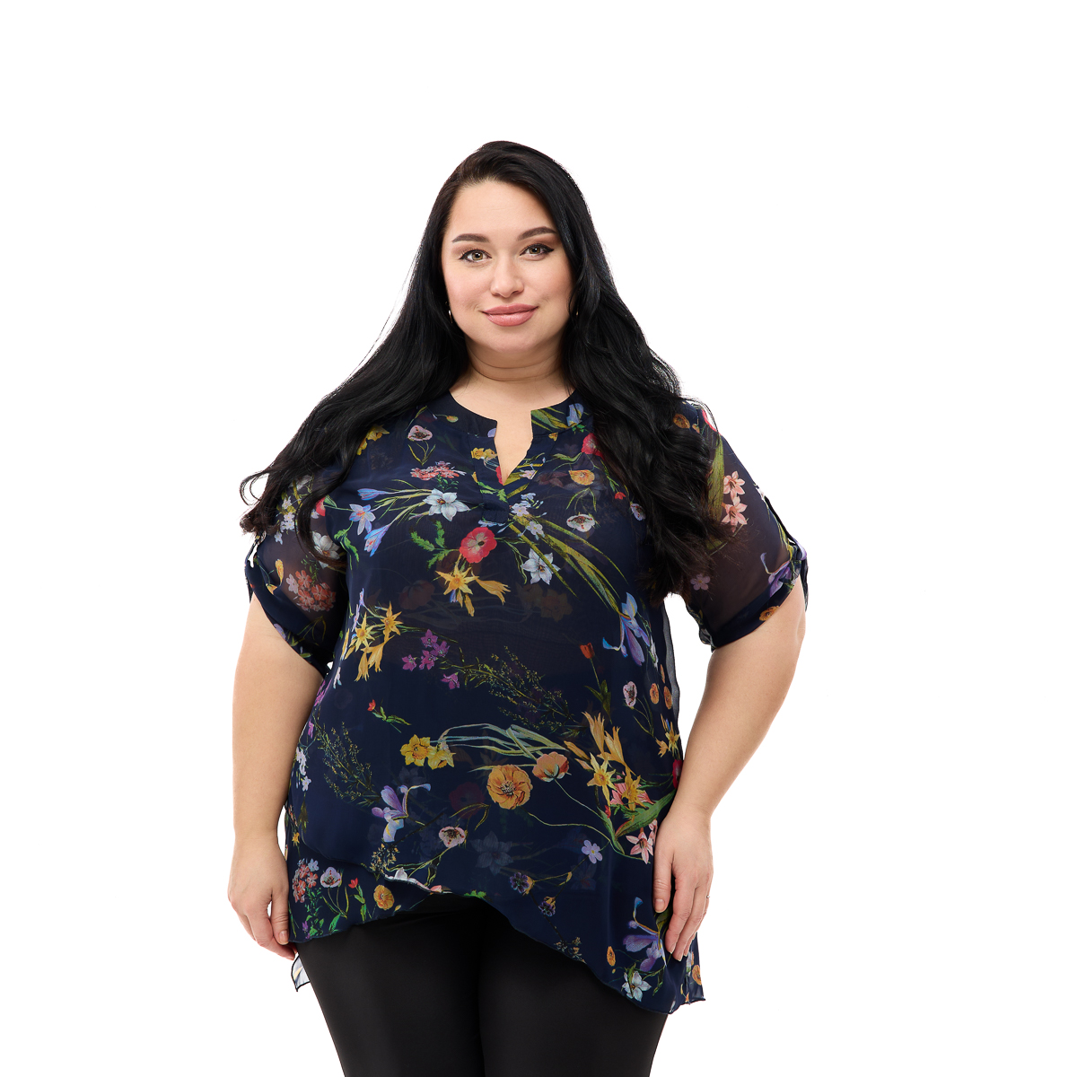 Нежный шифон на основе шелка изящно спадает по фигуре! Образ невероятно легкий и женственный. Стильный цветочный принт освежает и омолаживает! При этом всегда будет в моде! На выбор множество вариантов! И такой необычный крой! Эффект запаха внизу и регулируемый рукав деликатно нивелируют нюансы фигуры, а классический вырез и воротник стойка отлично акцентируют внимание на портретной зоне! Такая туника не останется незамеченной! В любой ситуации вы будете на высоте! Всегда стройная и привлекательная! Качественный шифон не боится многократной стирки, отлично сохраняет яркость красок и не меняет форму! Туника Флора – это покупка на долгие годы!
