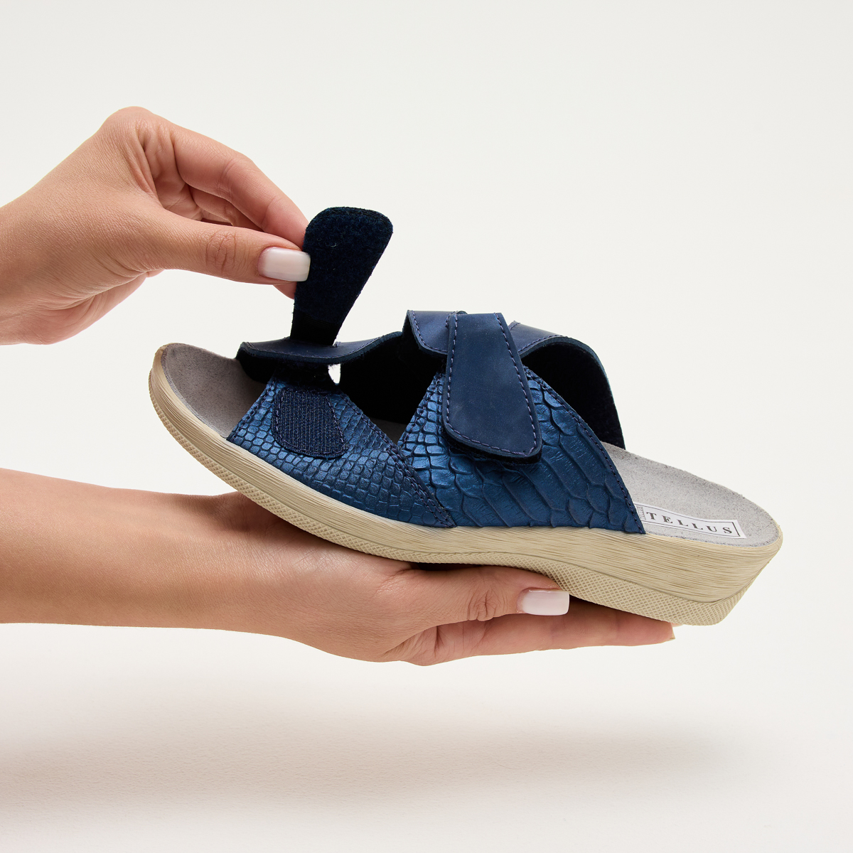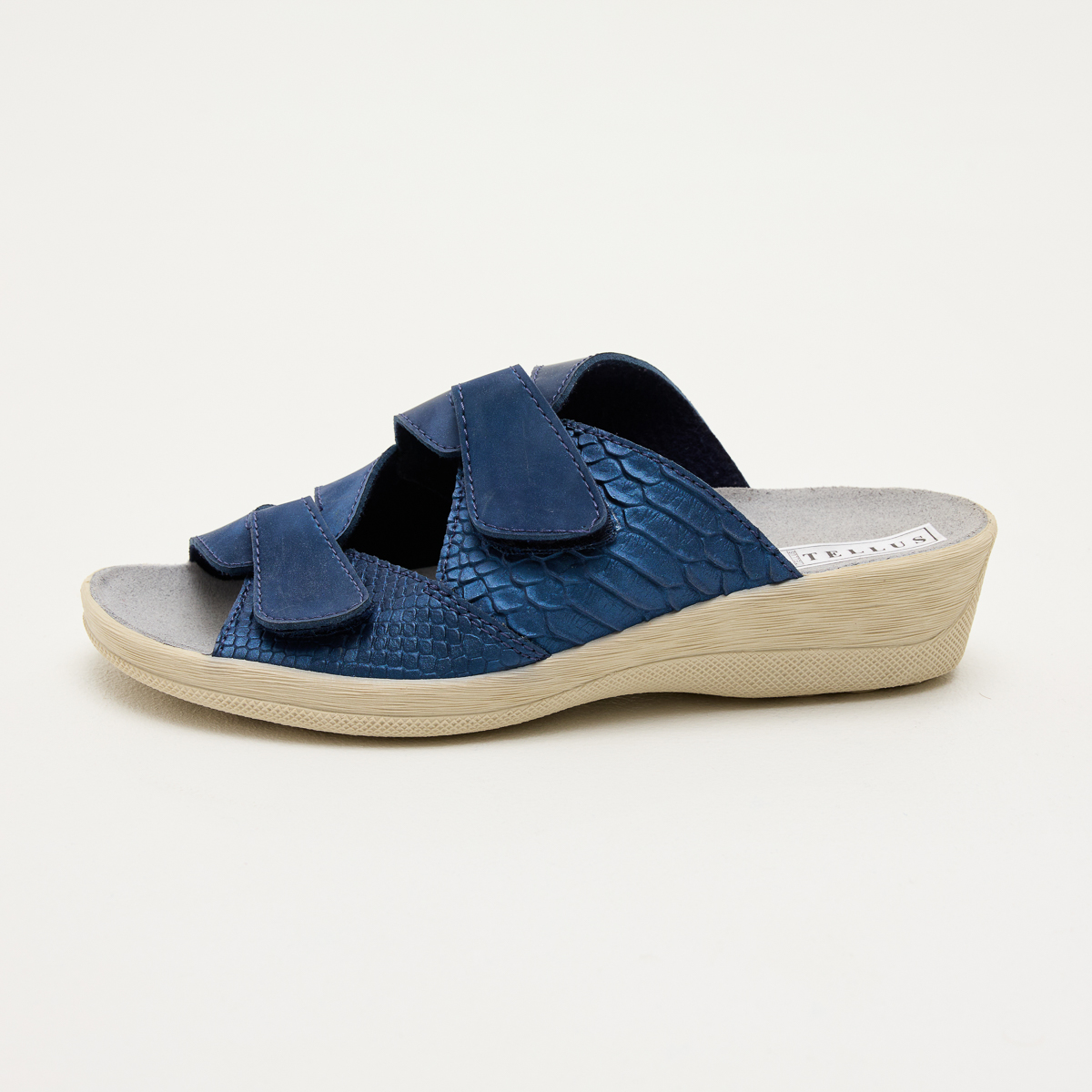 Босоніжки Стиль призначені прикрасити ваш образ! Тепер вам не доведеться жертвувати зручністю заради краси, навіть якщо у вас чутливі стопи. Легкість регулювання ширини взуття зробить процес носіння максимально комфортним. Пропонуються варіанти у синіх, білих та коричневих тонах, кожен з яких оформлений унікальною текстурою, що нагадує рептилію.