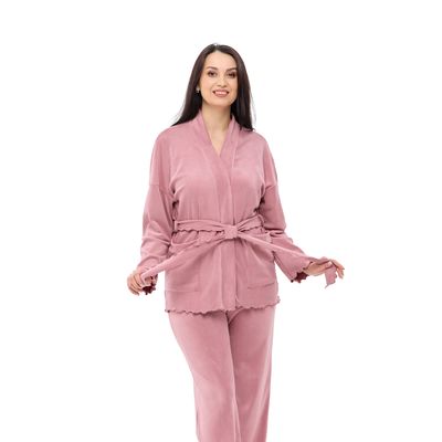 Стильний домашній Пані комплект створений для справжнього затишку та жіночності. Модель складається з м’якої кофти на запах із поясом та зручних брюк прямого крою. Лаконічний дизайн доповнений акуратними хвилястими краями по низу виробу та рукавах, що додає образу легкості та делікатності.